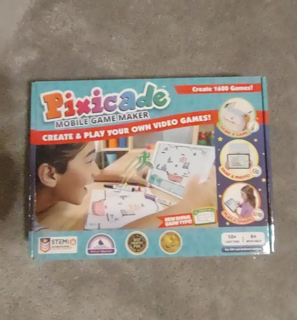 This Pixicade Mobile Game Maker lets you create and play your own video games. It can create 1600 games and includes new bonus game types. It's suitable for ages 10+ or 6+ with help.