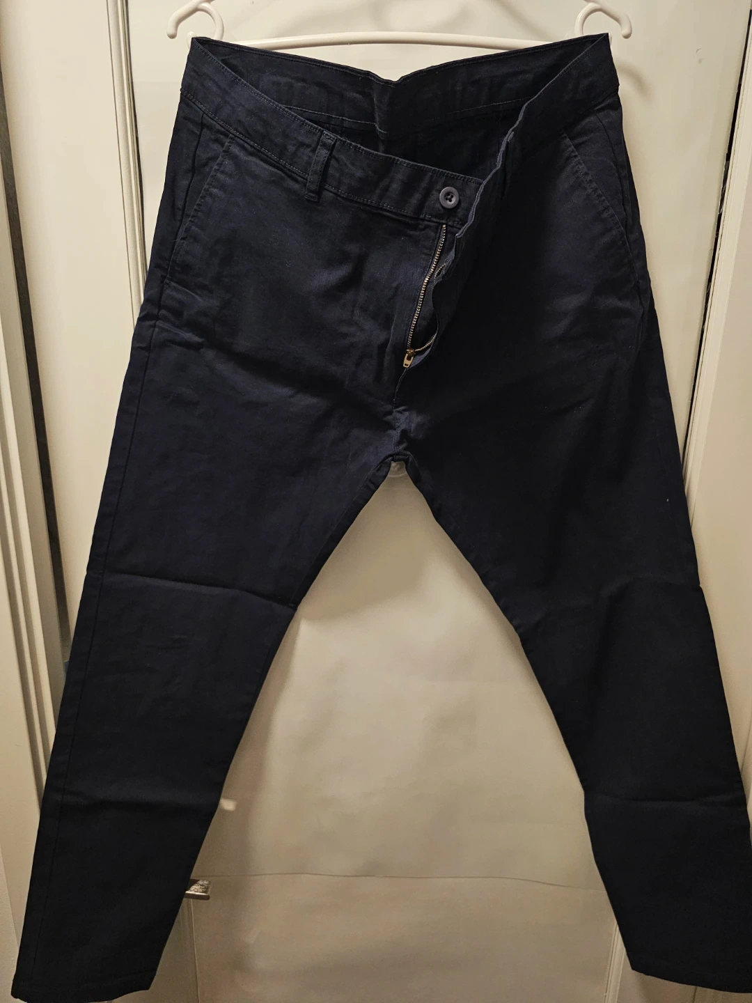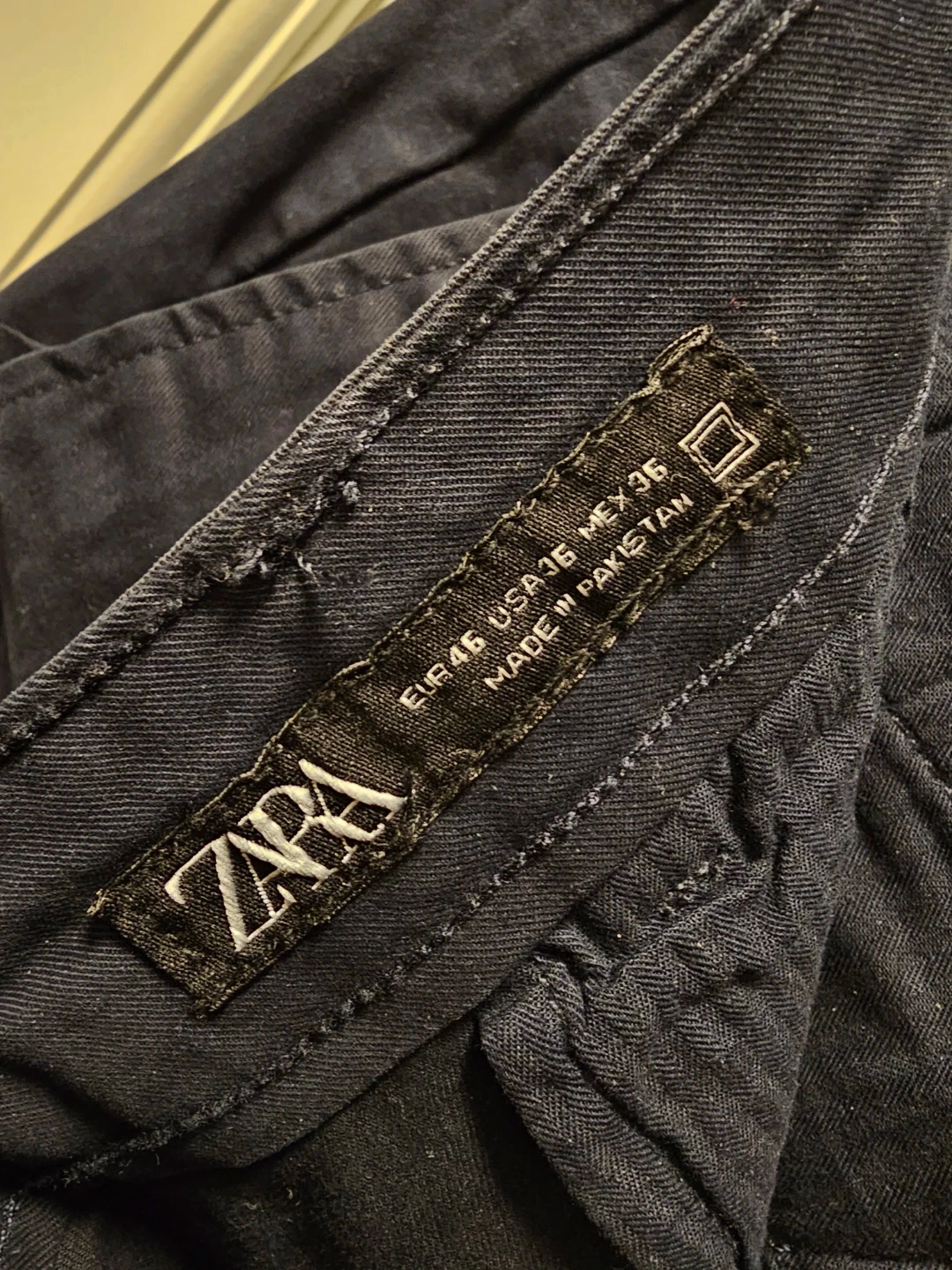 Navy blue chinos from Zara. Made in Pakistan. These pants are a size 36 waist. They're a versatile staple for any wardrobe. Perfect for dressing up or down!