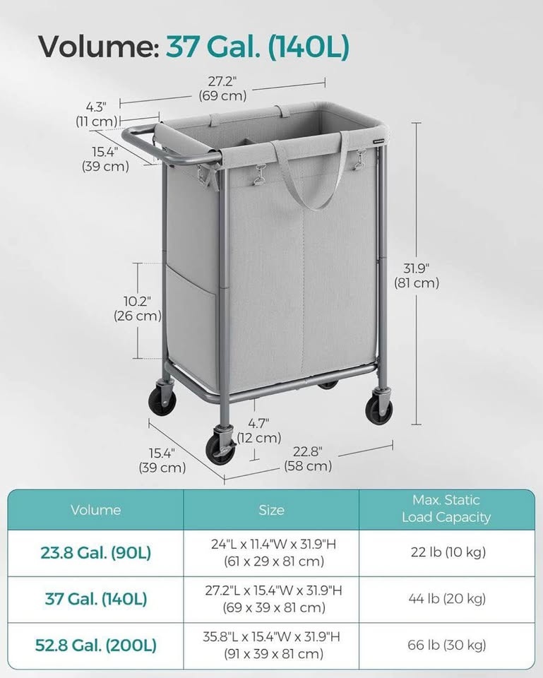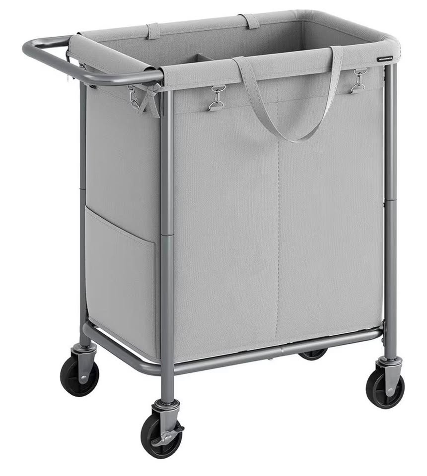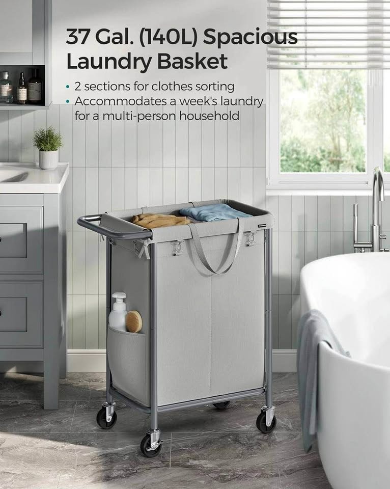 Large 2-section rolling laundry hamper with a sturdy steel frame, removable liner, and smooth wheels for easy movement. Perfect for organizing laundry in any room.