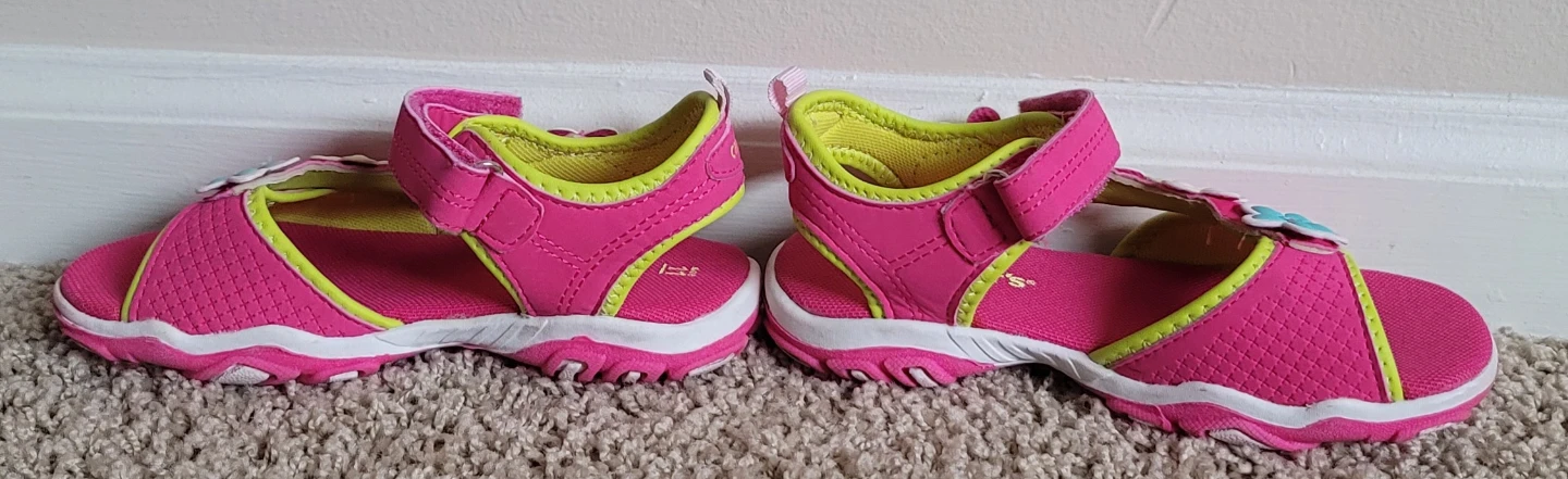 These Carter's sandals are a vibrant pink with lime green accents and cute flower details. They feature adjustable straps for a secure fit. Size is 11.