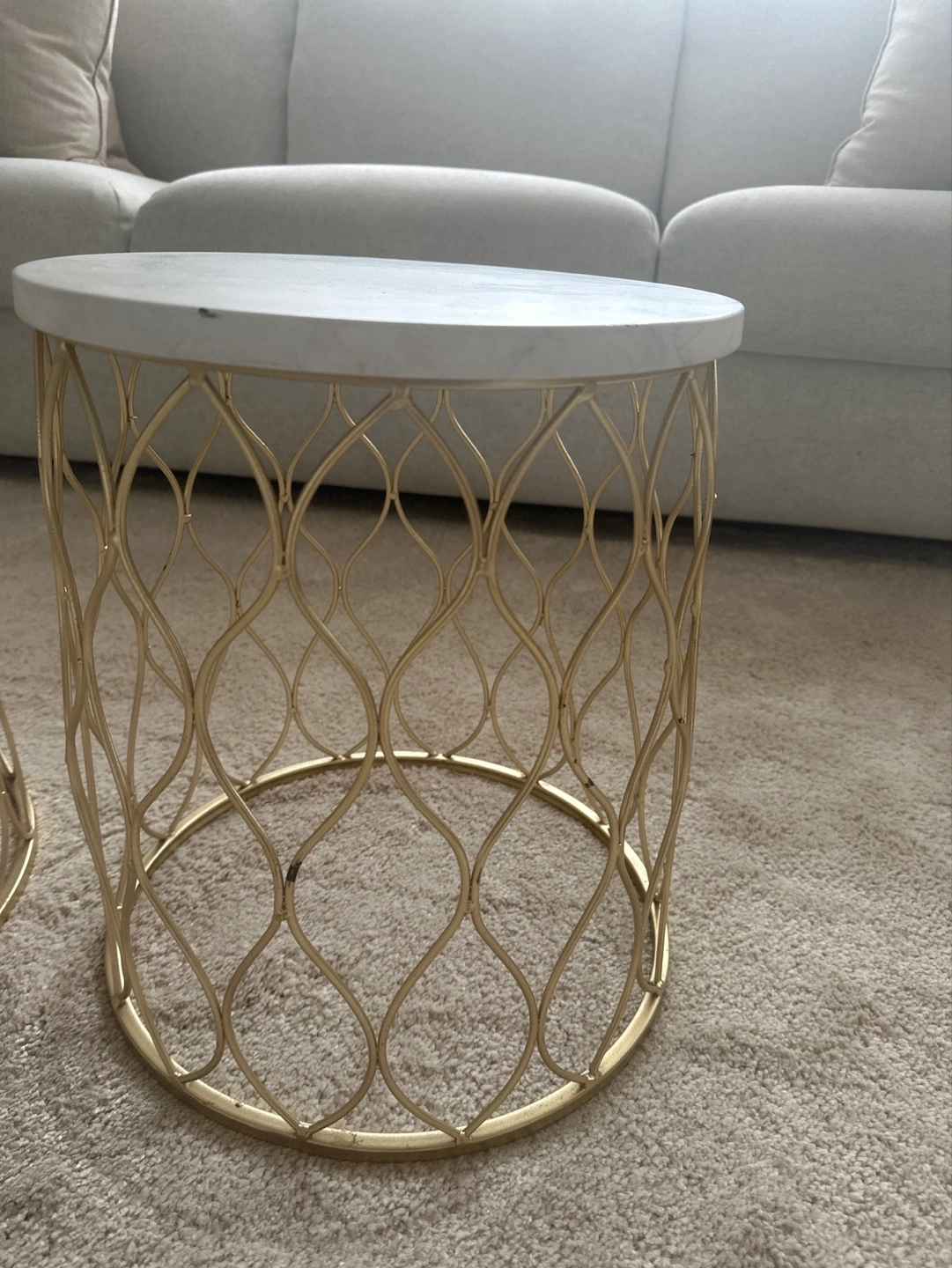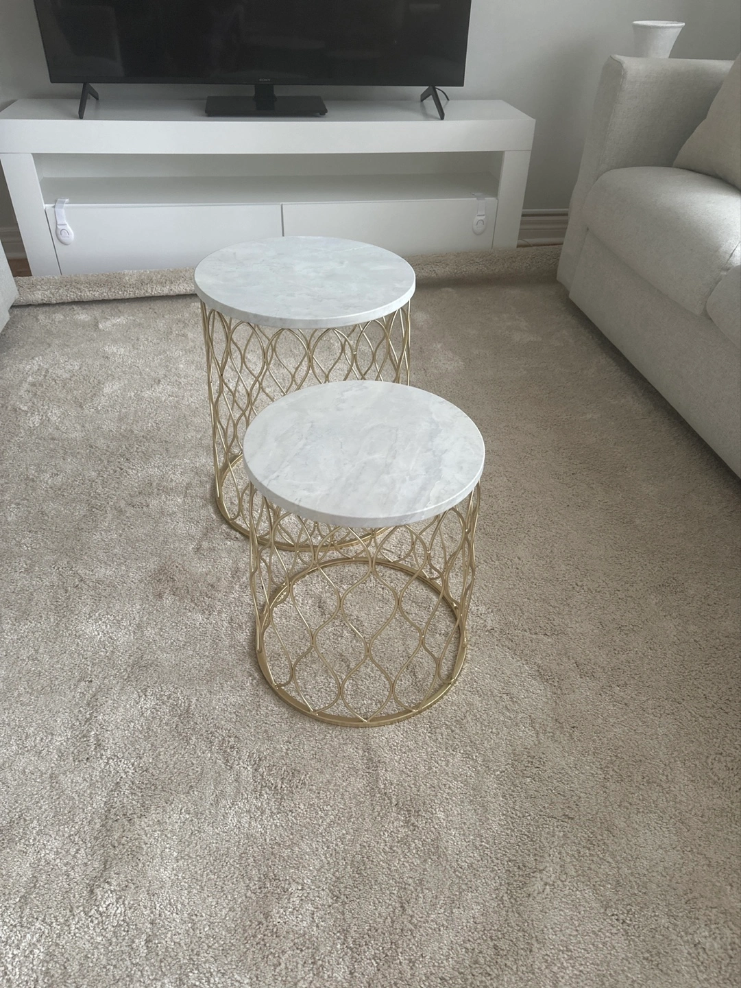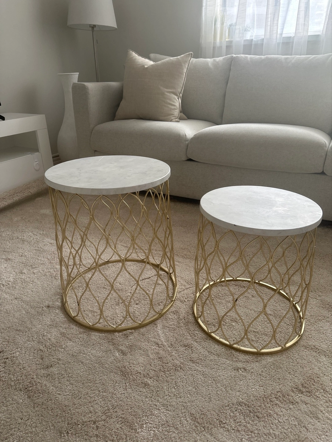 Pair of nesting tables. Marble tops and gold metal frames. Elegant design. Perfect for a living room or bedroom.Some signs of use.
