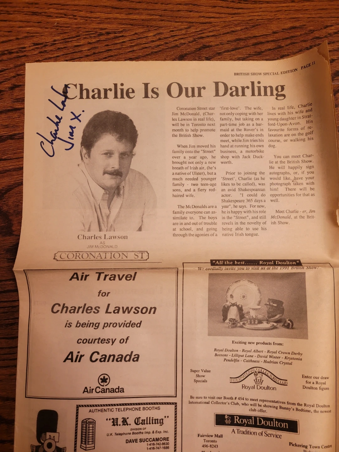 This is a newspaper clipping featuring an article titled 'Charlie Is Our Darling' about actor Charles Lawson, who plays Jim McDonald on Coronation Street. It was published in the British Show Special Edition. The clipping also includes advertisements for Air Travel courtesy of Air Canada and Royal Doulton products from the 1991 British Show.