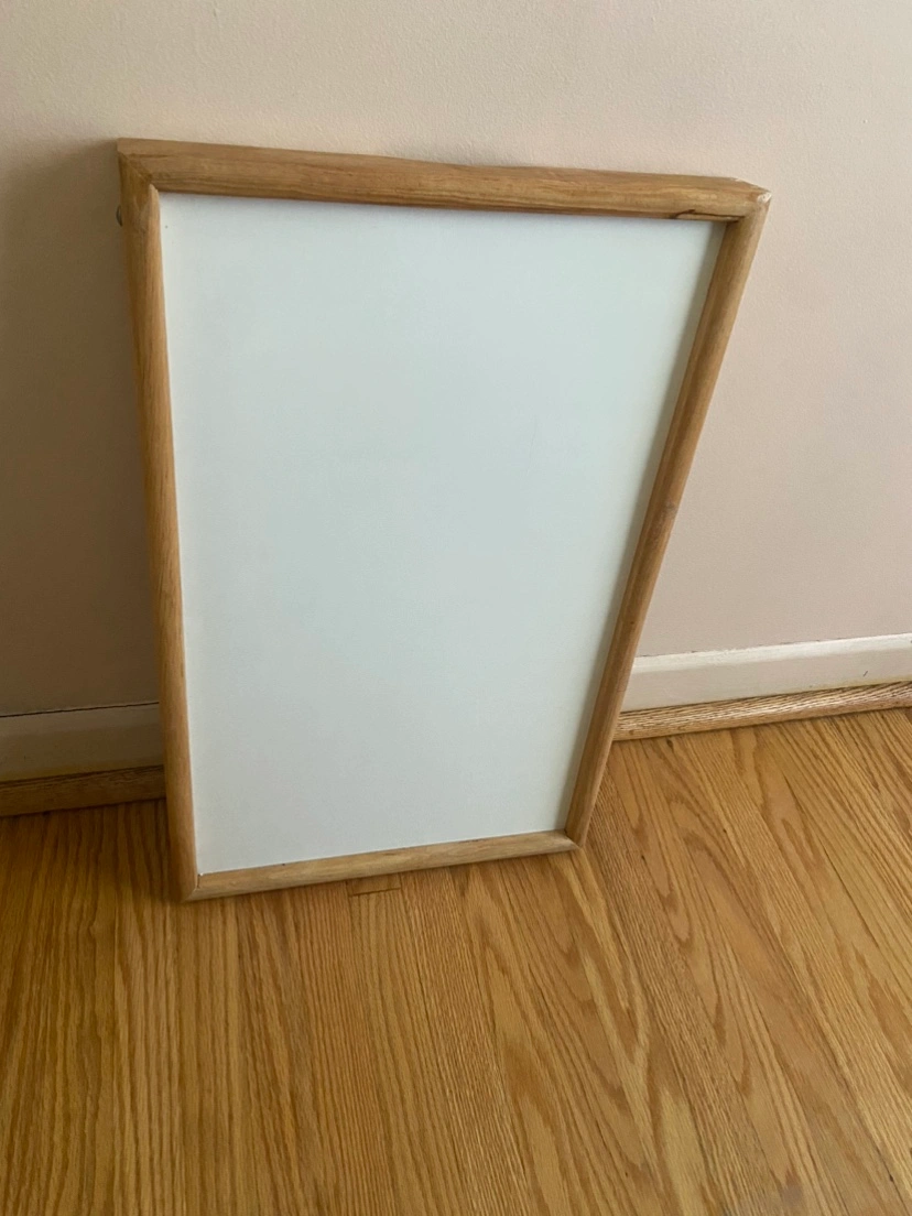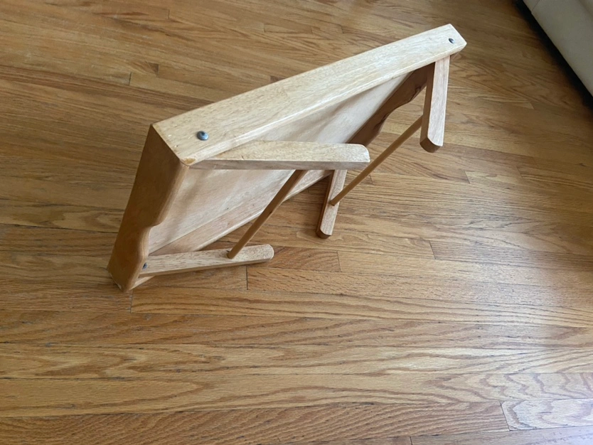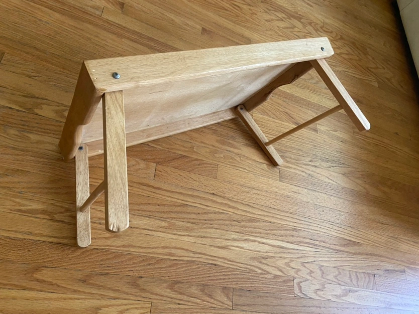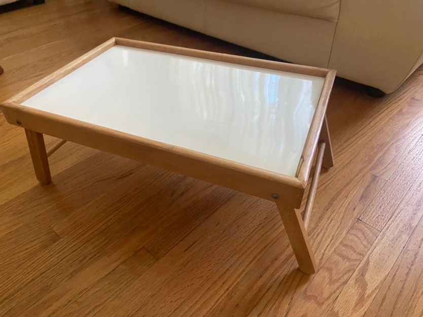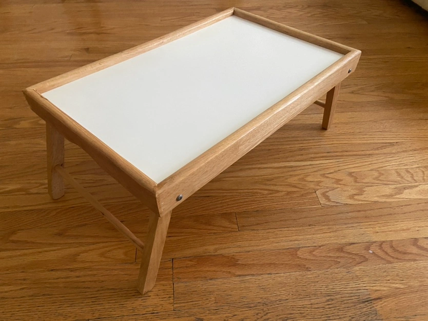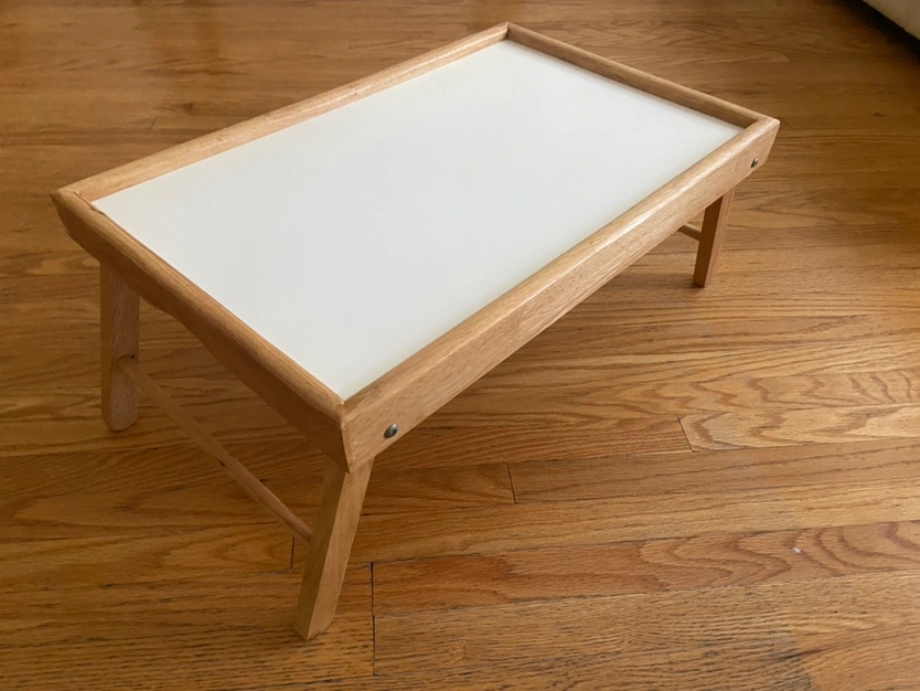 A wooden tray table with foldable legs. The surface is white. It is in good condition. You will enjoy using it to have breakfast in bed !