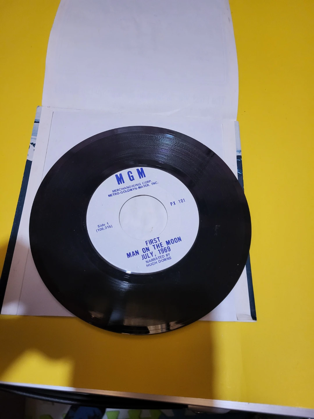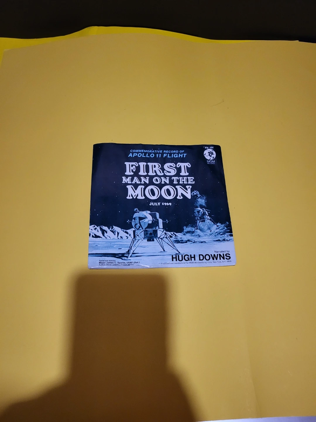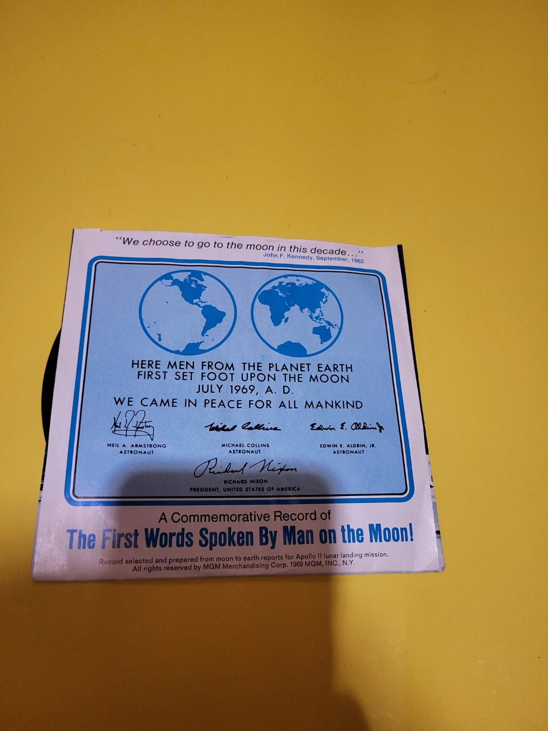 This is a commemorative record of the Apollo 11 lunar landing in July 1969. It includes "The First Words Spoken By Man on the Moon" and is narrated by Hugh Downs. Record selected and prepared by MGM Merchandising Corp.