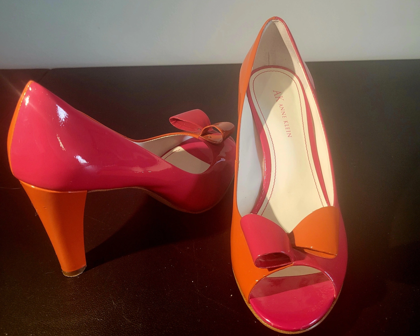 Make a bold statement with these color-block peep-toe pumps. Featuring a striking combination of vibrant pink and sunset orange in a high-shine patent finish, these heels are finished with a charming two-tone bow at the toe. The sturdy heel and cushioned insole offer a blend of high-end style and wearability.