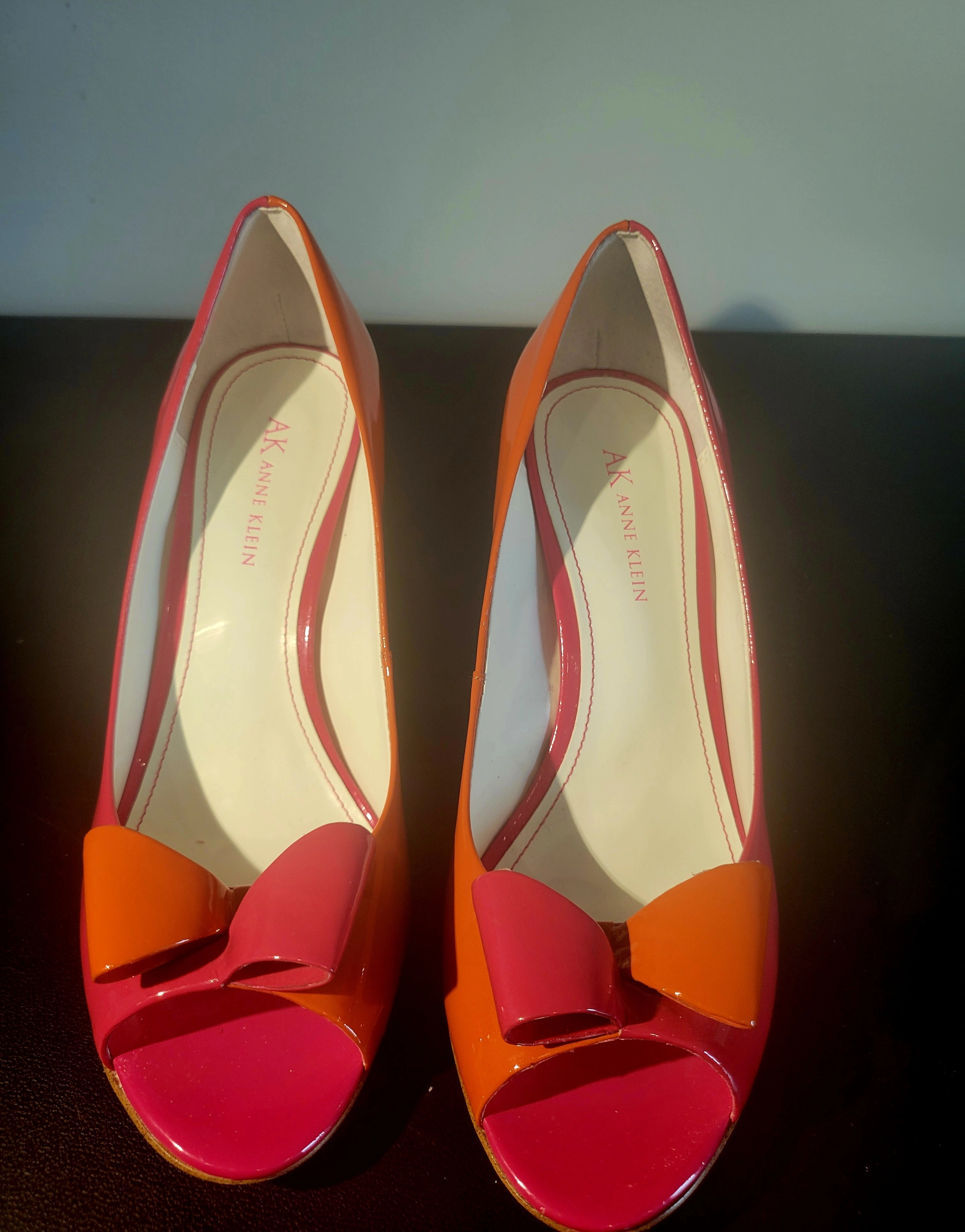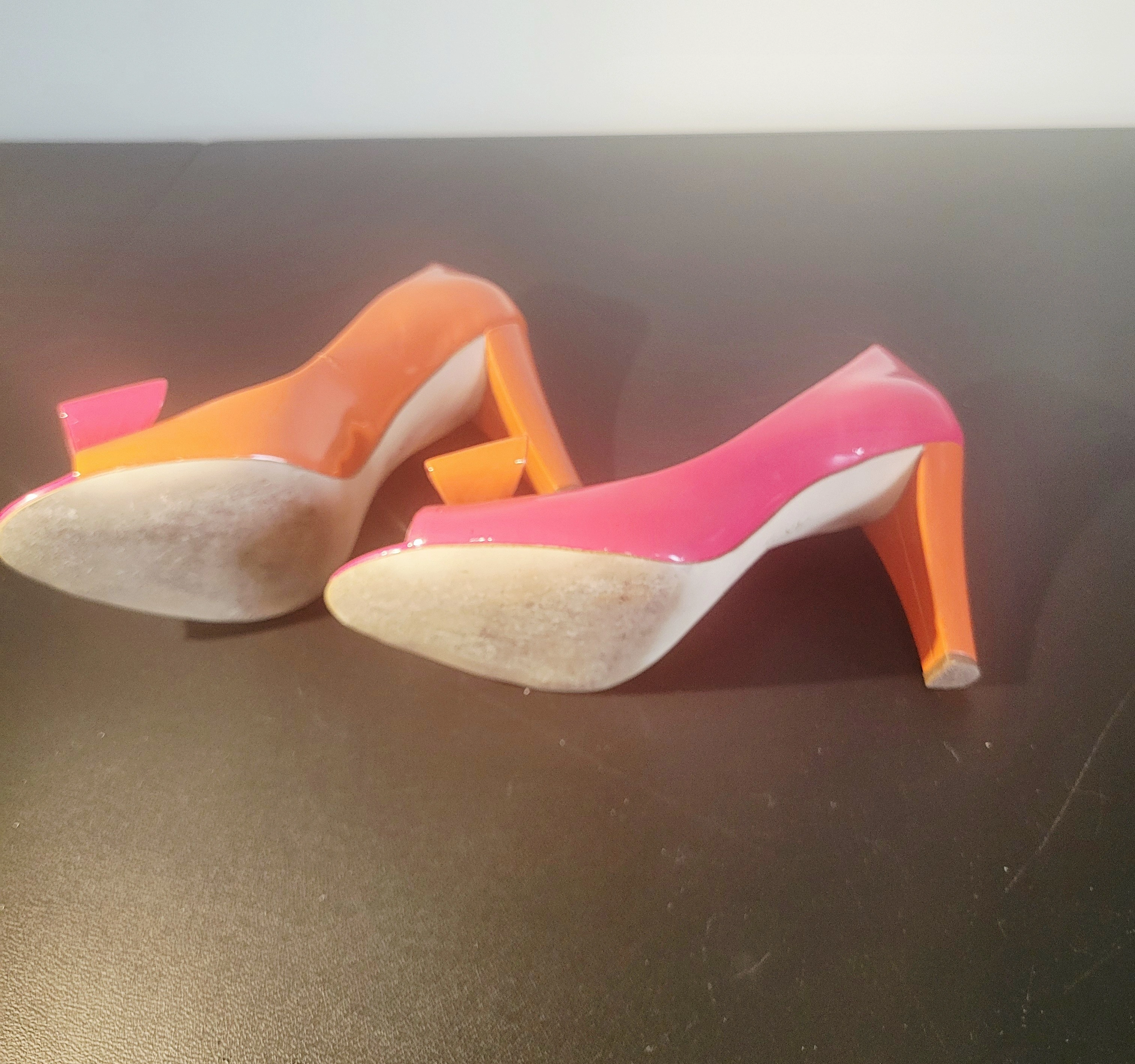 Make a bold statement with these color-block peep-toe pumps. Featuring a striking combination of vibrant pink and sunset orange in a high-shine patent finish, these heels are finished with a charming two-tone bow at the toe. The sturdy heel and cushioned insole offer a blend of high-end style and wearability.