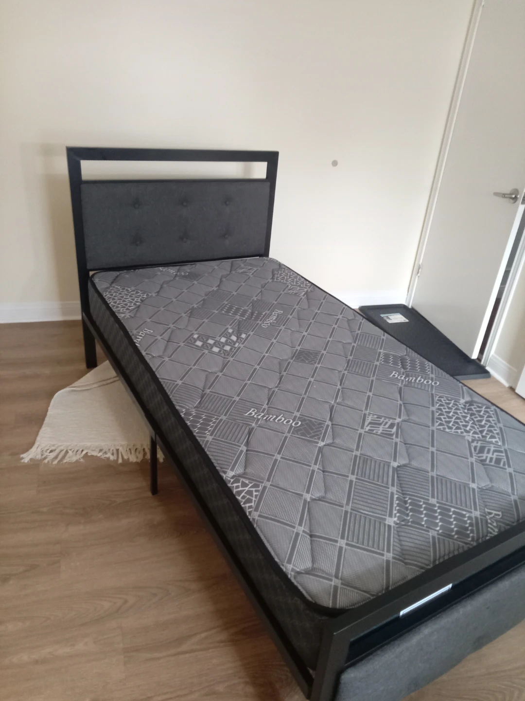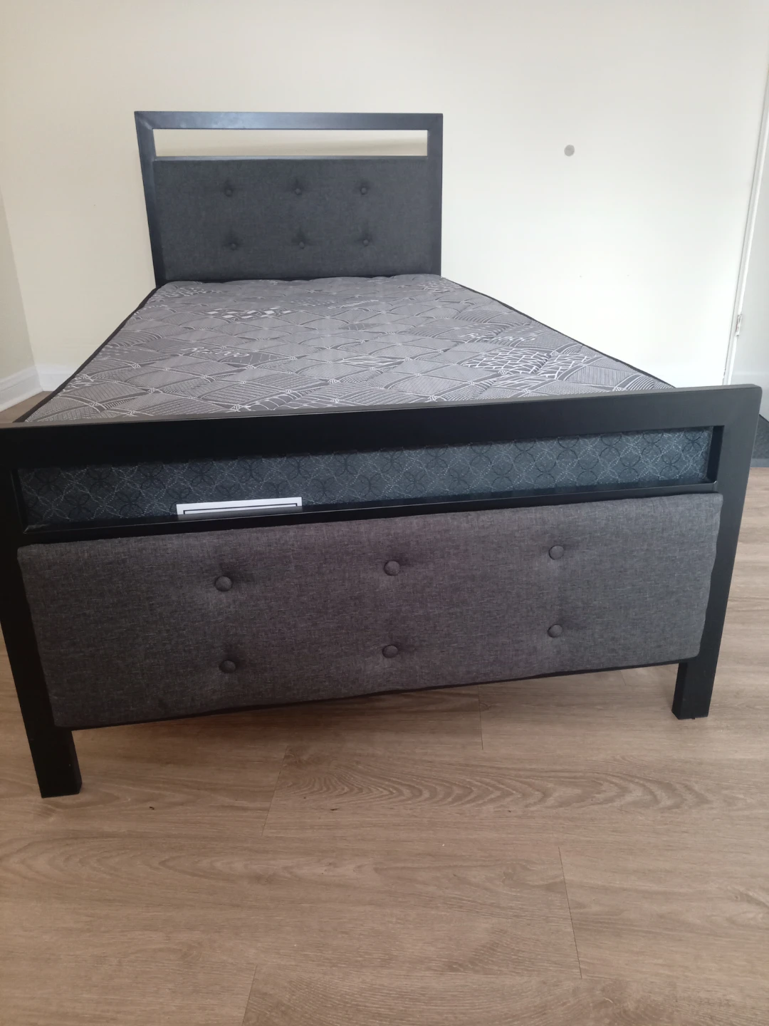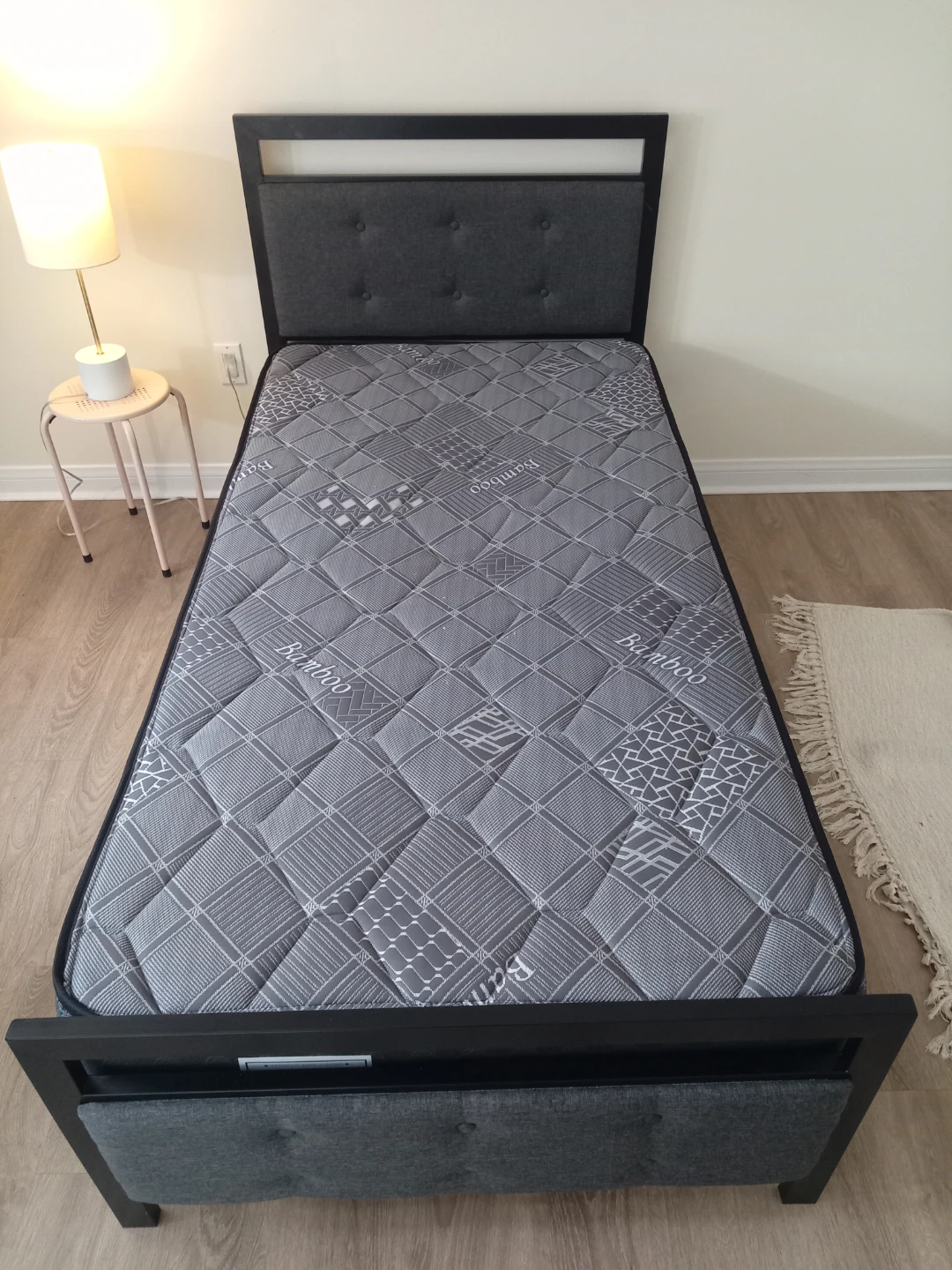 Twin size bed frame with a grey upholstered headboard and footboard. Includes a grey patterned mattress with "Bamboo" printed on it. Great for a smaller room or guest space! used on fo 4 months only