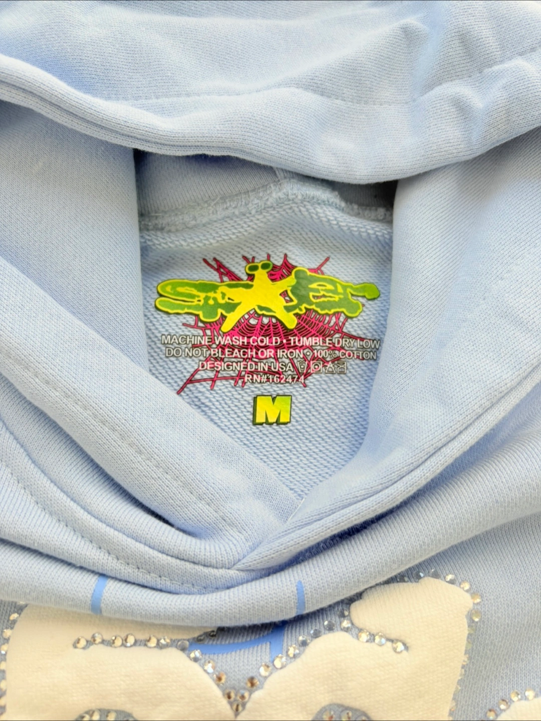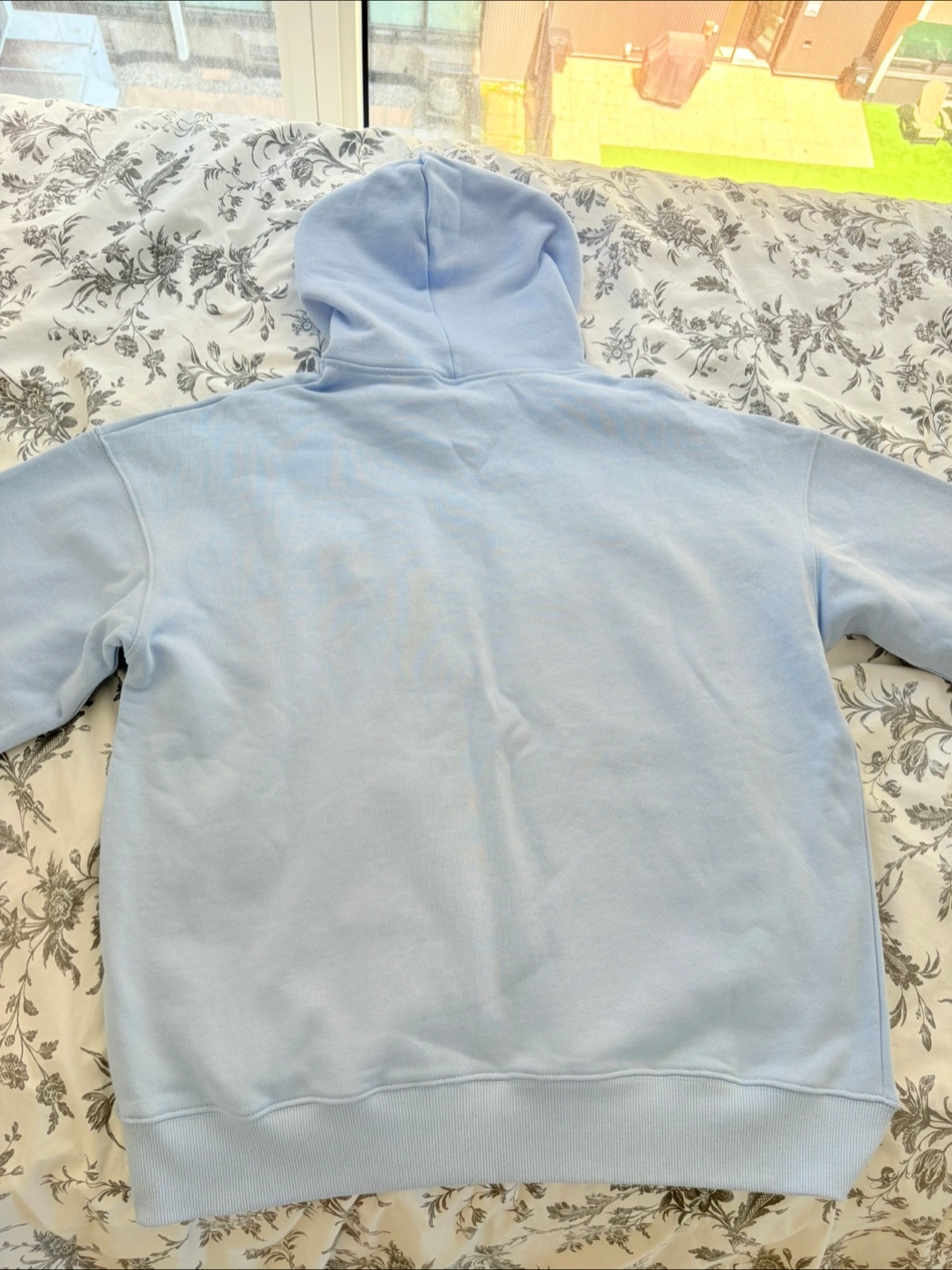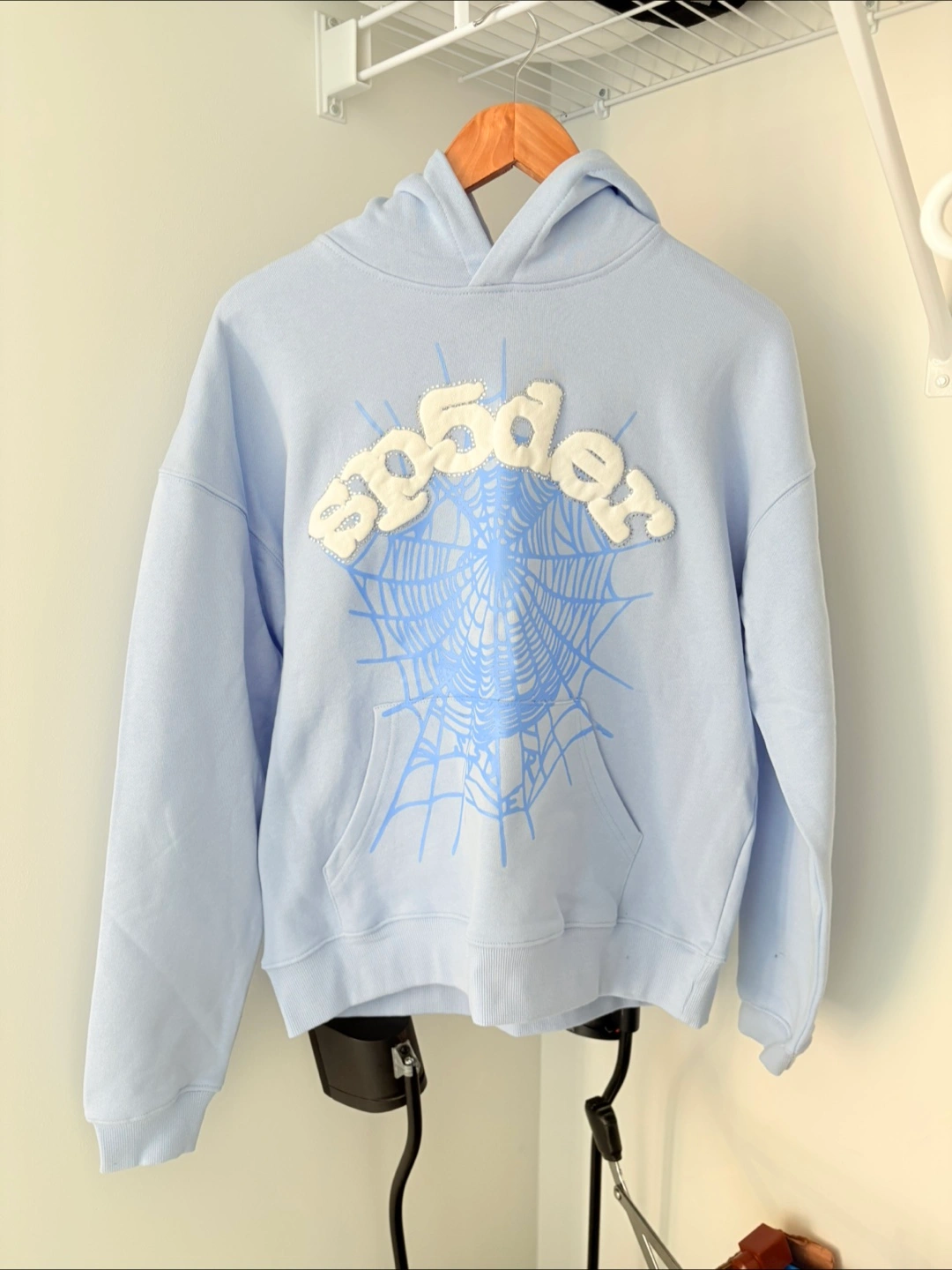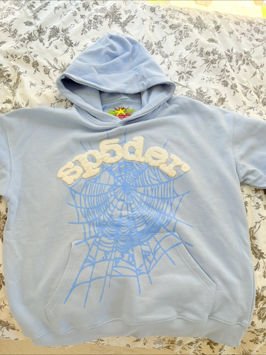 Selling a gently used Sp5der hoodie in size medium. It's a light blue colour with a unique spiderweb design. Machine wash cold and tumble dry low. Dm for more details, and negotiable price.