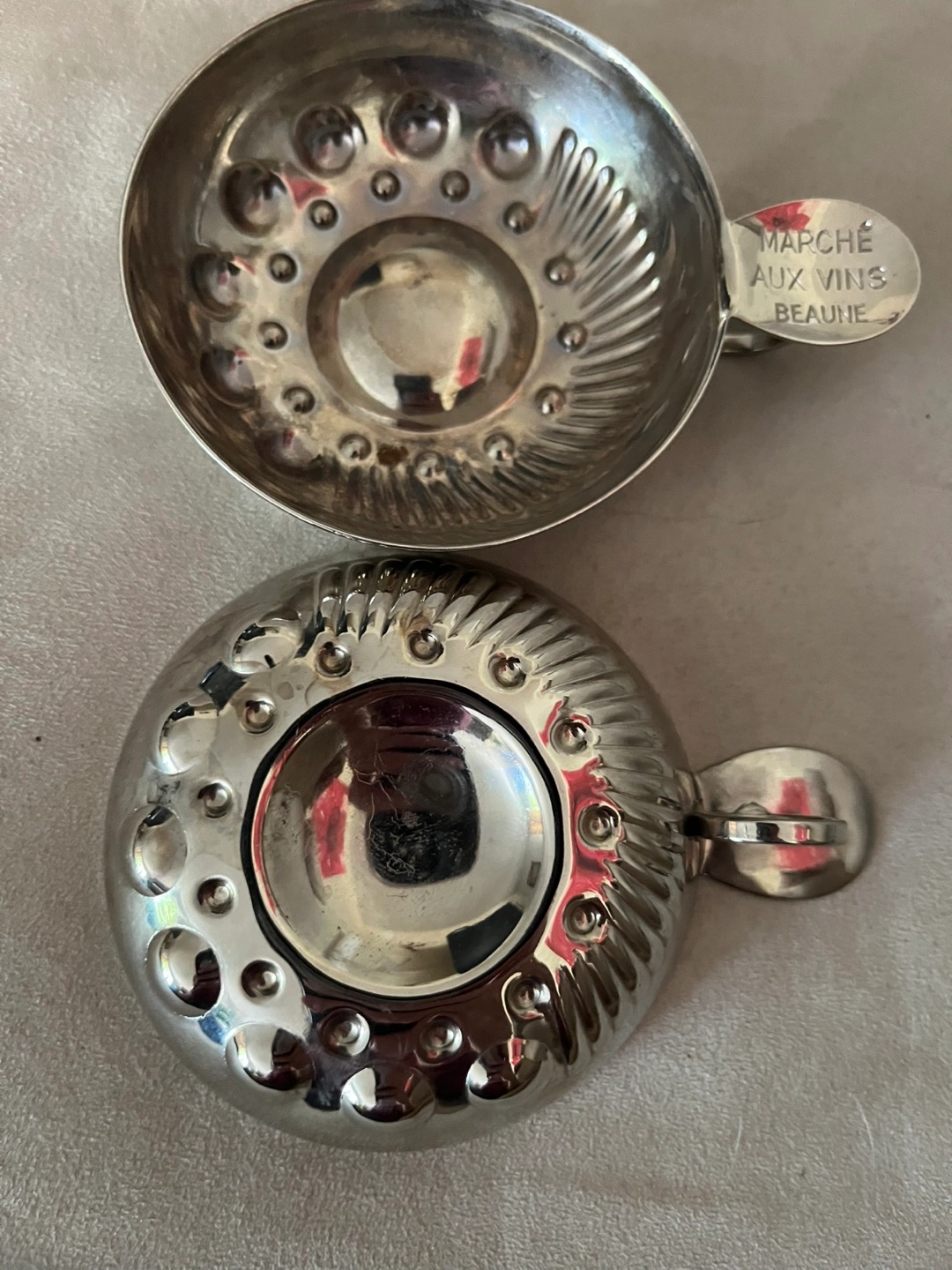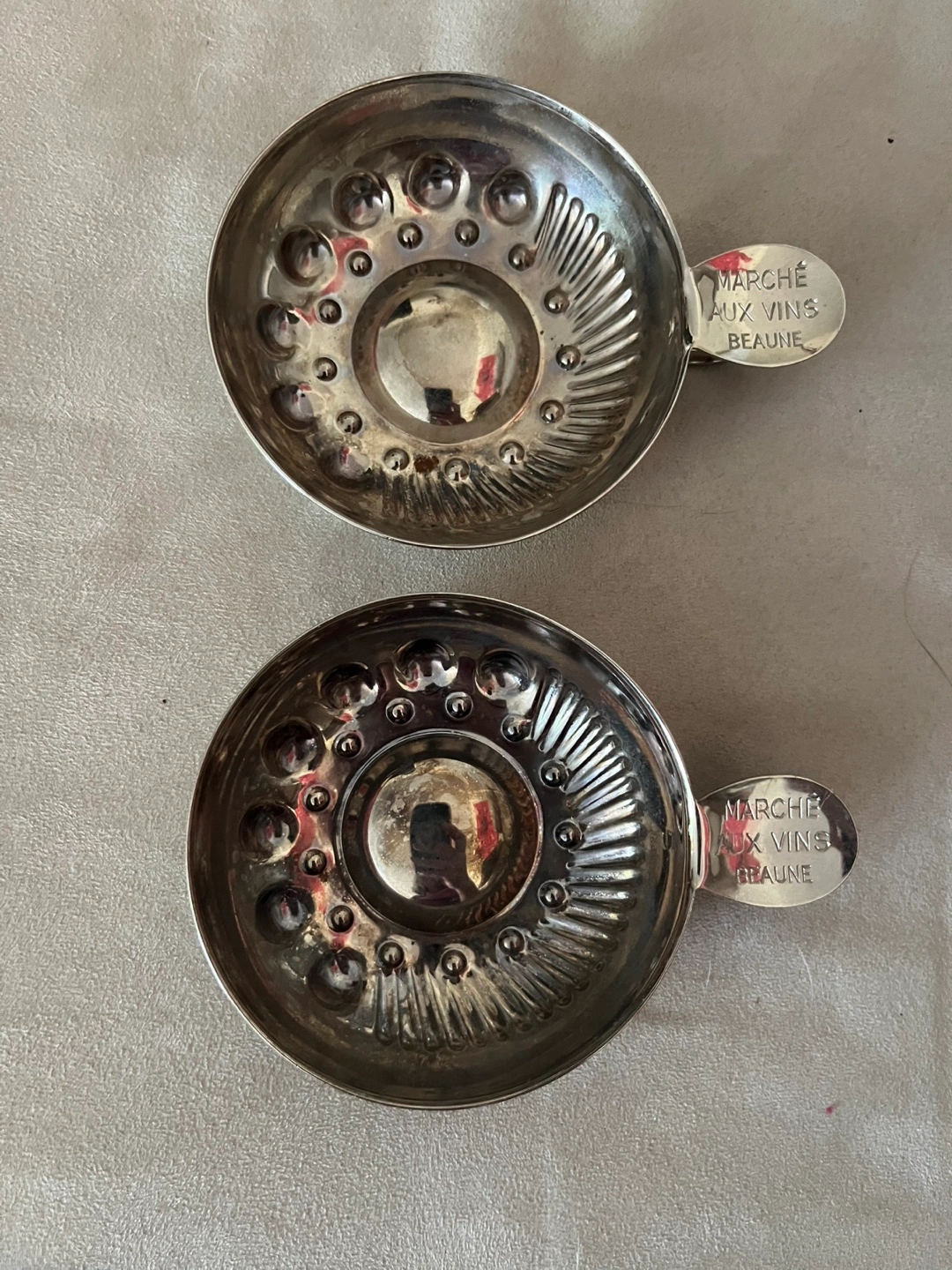 Price is for both. Two silver wine tasters from Marché aux Vins Beaune. Stainless steel with silver plate on the inside. They are in good condition and ready to be used for your next wine tasting event.