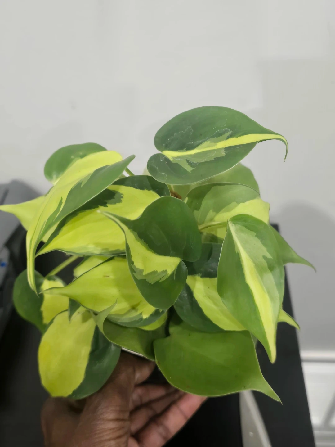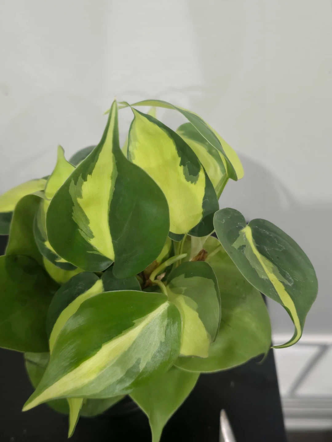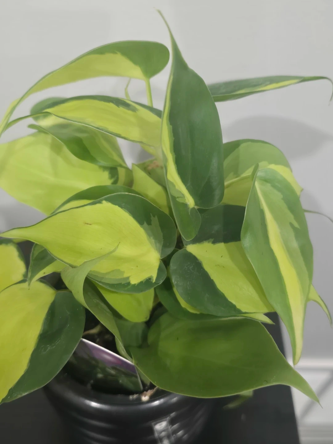 A lovely Philodendron Brasil plant with heart-shaped leaves featuring green and yellow variegation. It's in a black pot.
