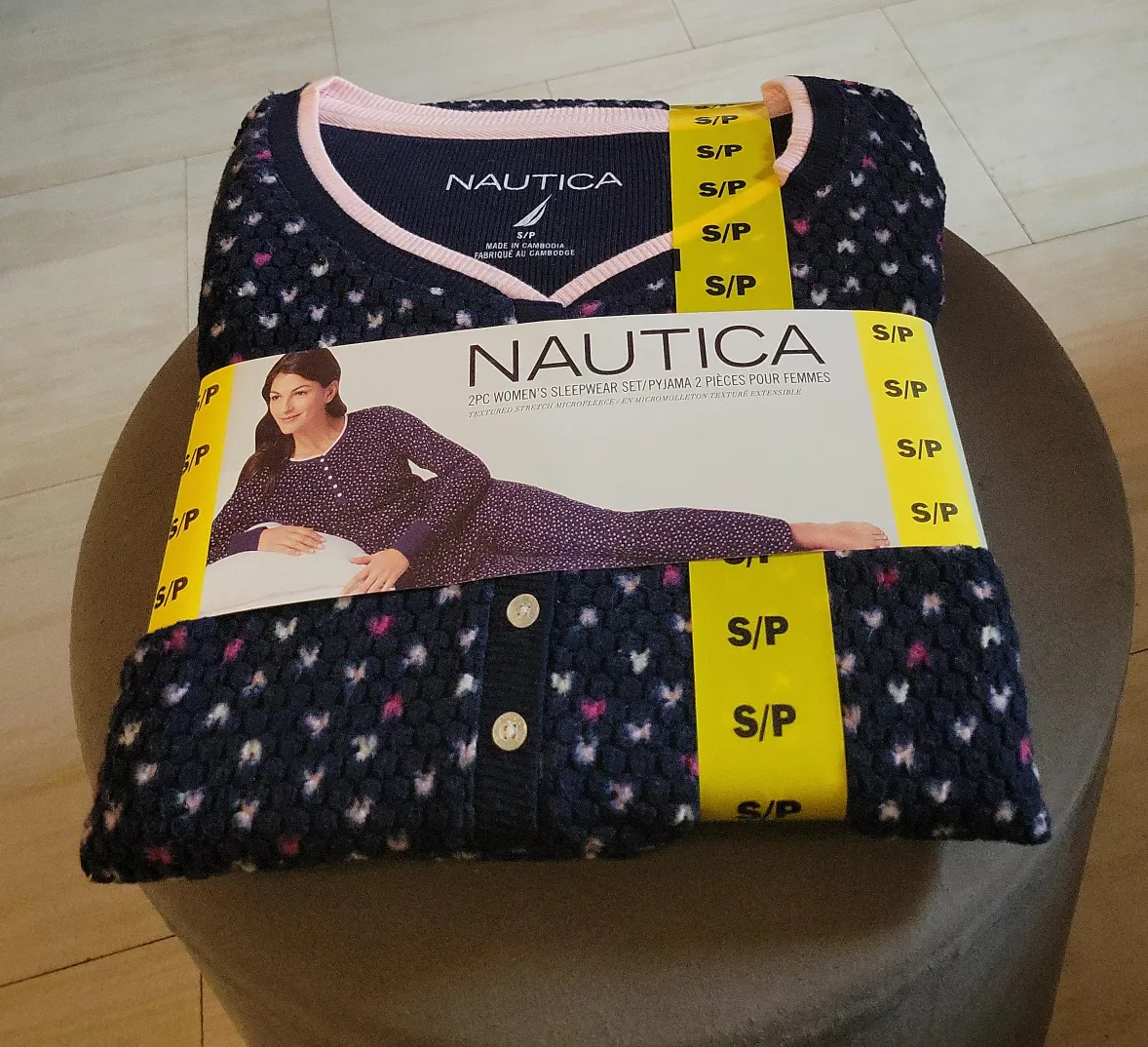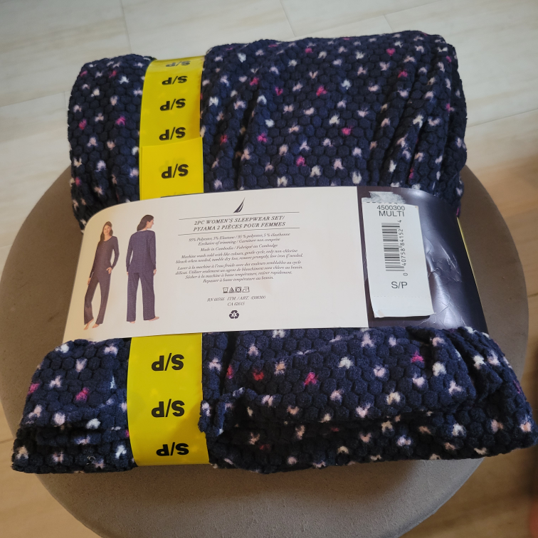 Cozy Nautica 2-piece women's sleepwear set in size S! The set features a lovely navy blue colour with a subtle pattern. Made with a soft and comfortable microfleece texture, perfect for a relaxing night's sleep. Brand new and ready for a new home!