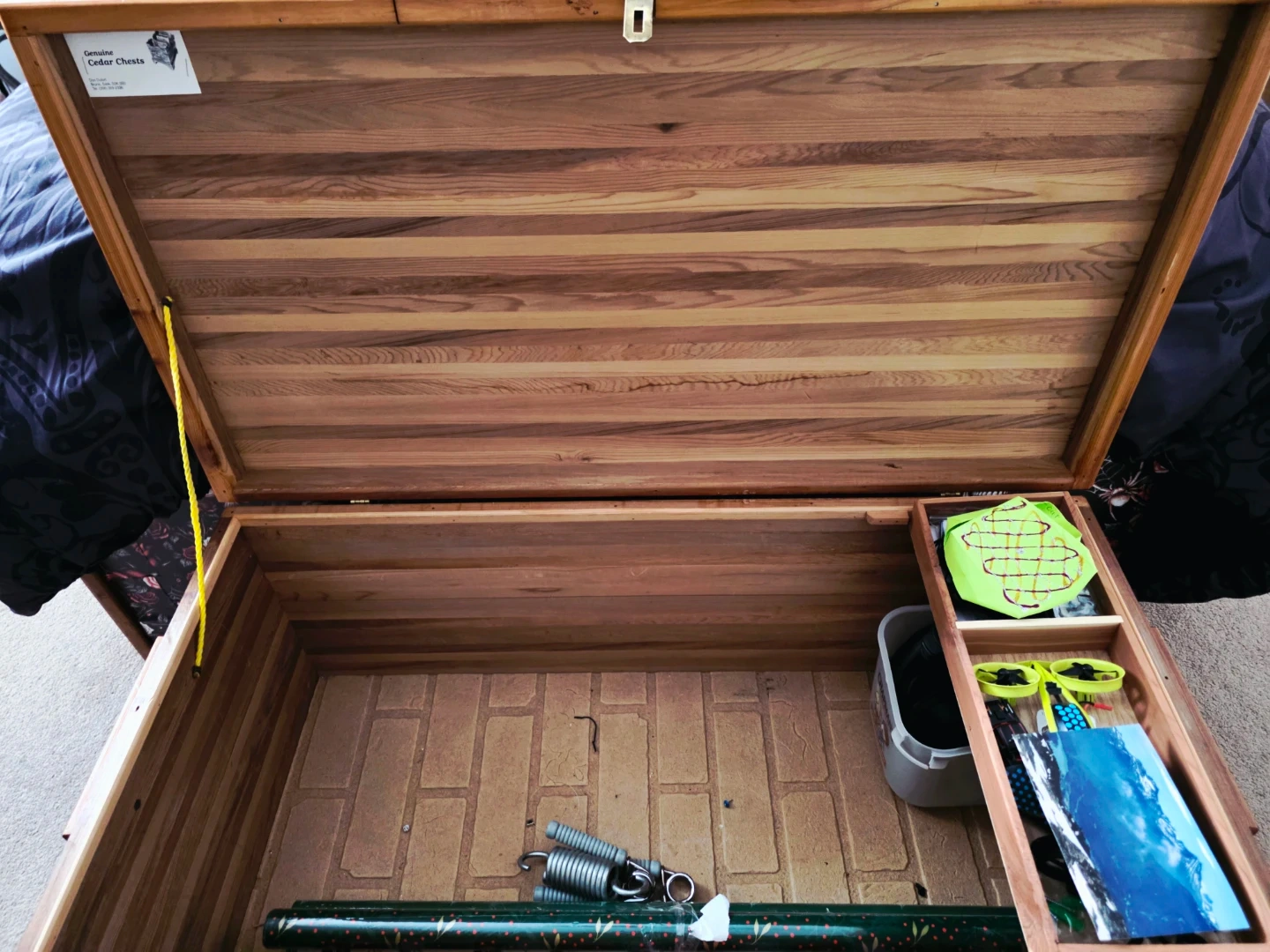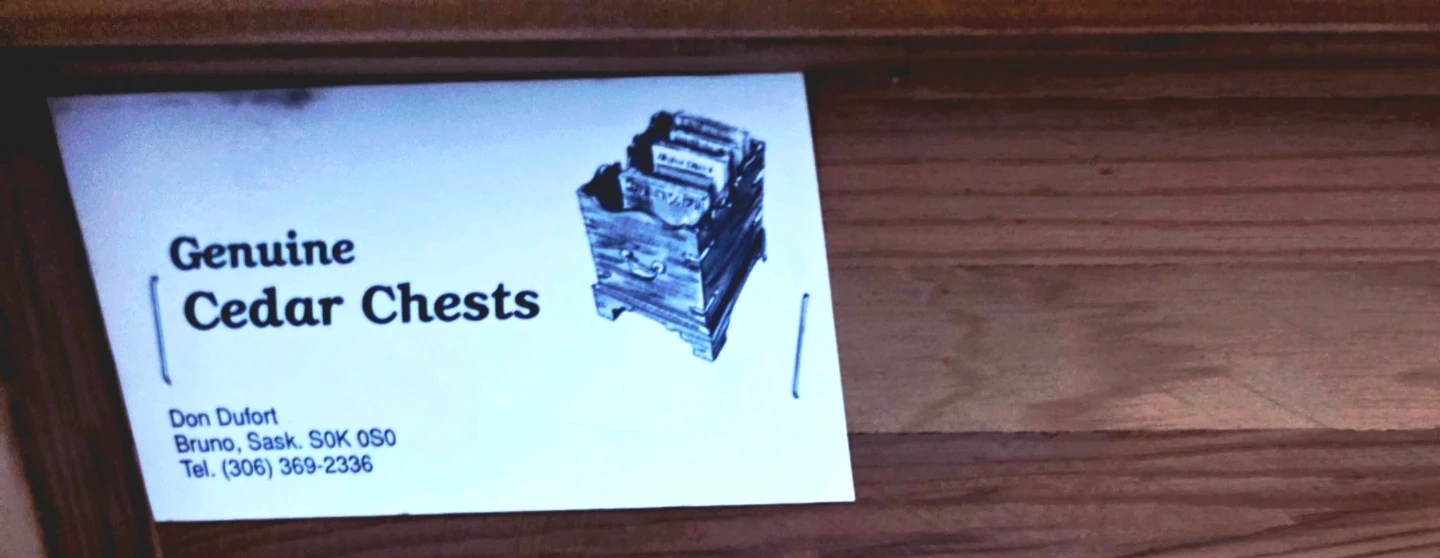 A genuine cedar chest made from wood. It's a great storage solution for blankets or seasonal clothing. The interior is lined with cedar, known for its natural moth-repelling properties.
