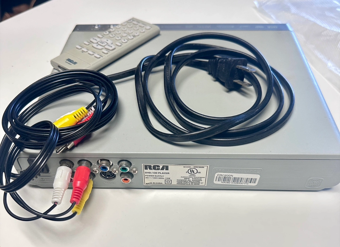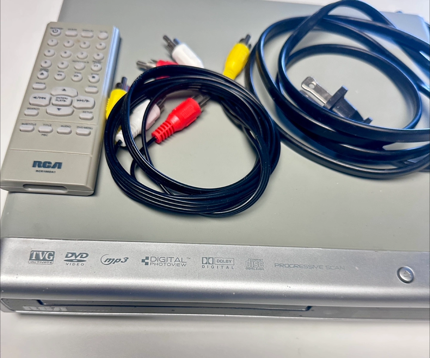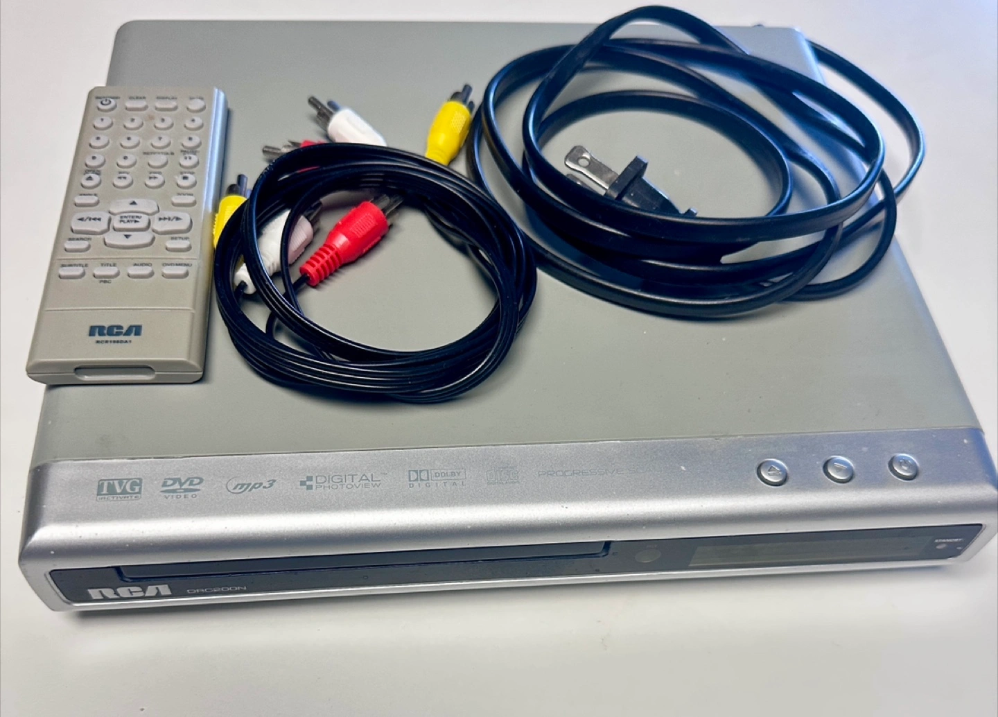 RCA DVD player. Includes remote and AV cables. Plays DVD and CD. Progressive scan. Very Good condition, working perfectly, cables available for additional price