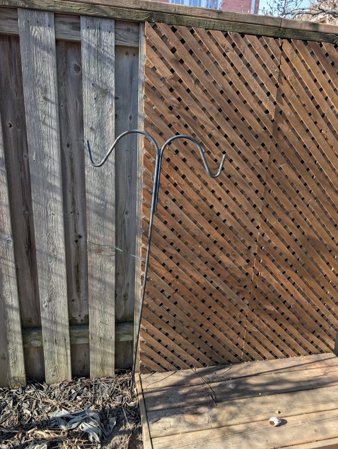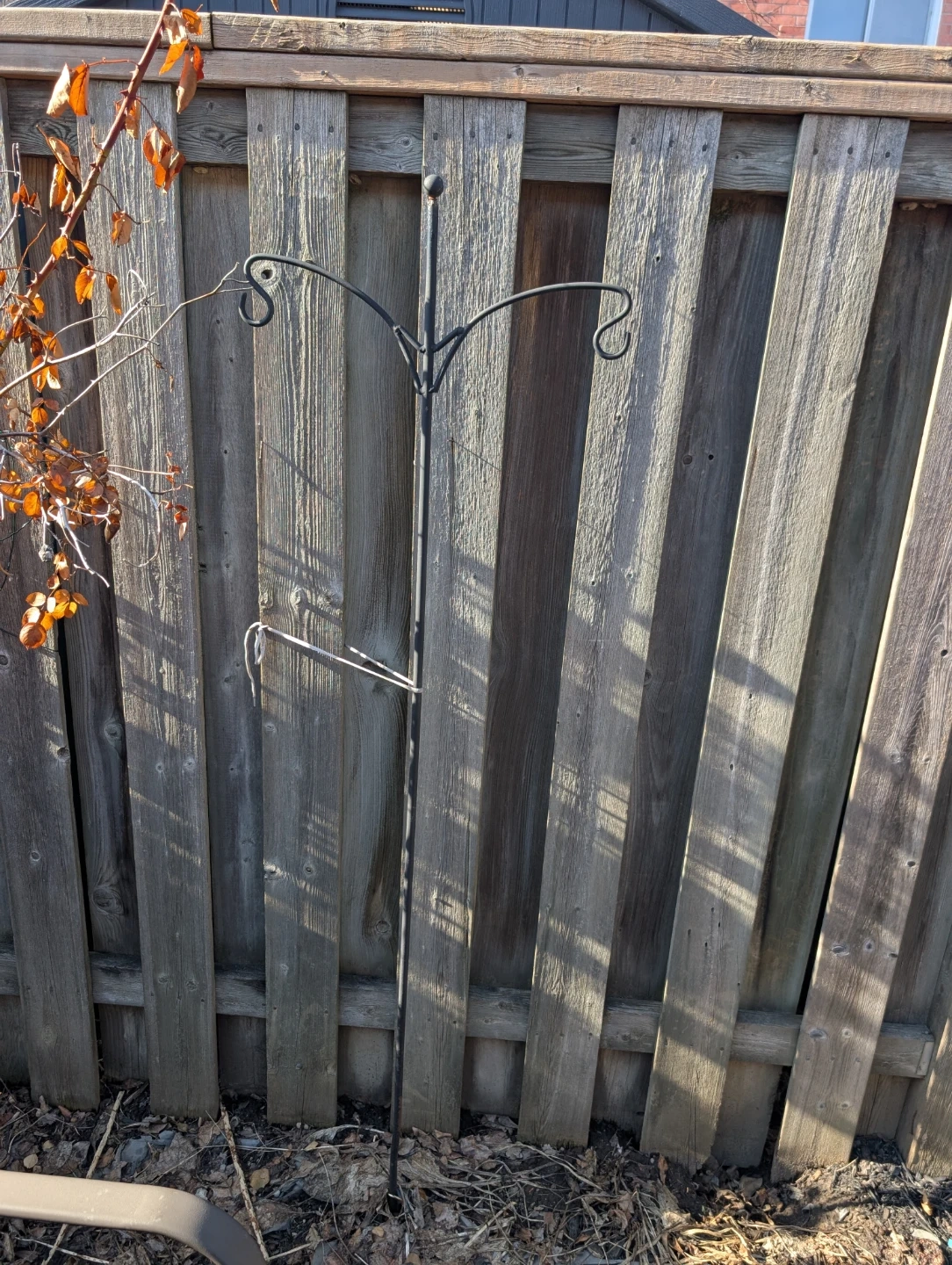 A sturdy black metal shepherd's hook for your garden. It's perfect for hanging bird feeders or decorative lanterns. This hook stands tall, offering great visibility for your hanging items.