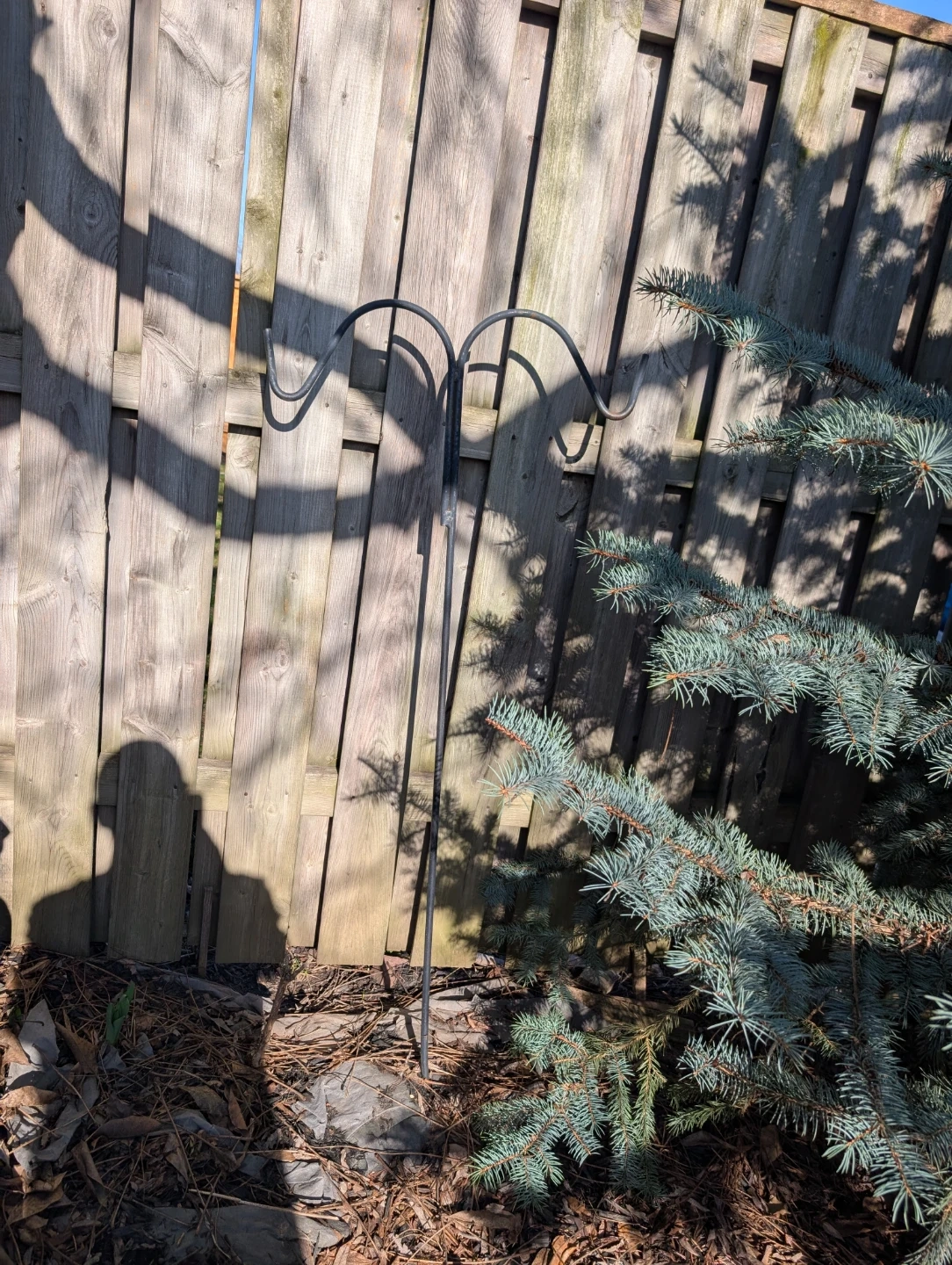 A sturdy black metal shepherd's hook for your garden. It's perfect for hanging bird feeders or decorative lanterns. This hook stands tall, offering great visibility for your hanging items.
