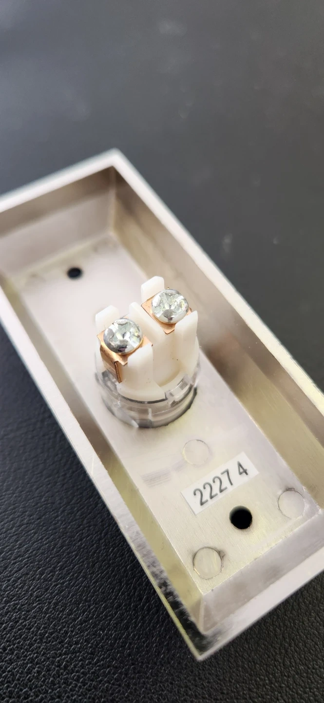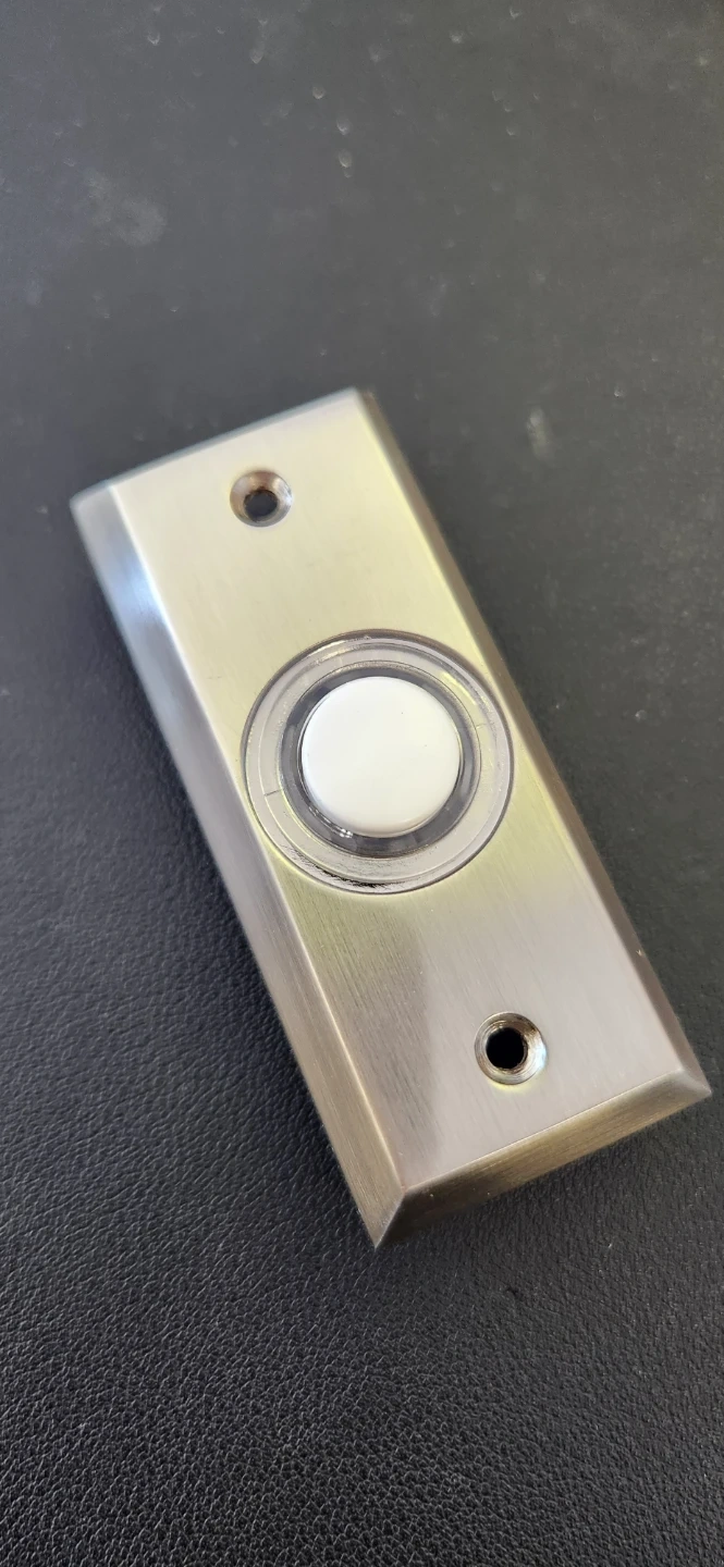 Brushed metal doorbell button with a white push-button. Mounts easily with two screws. It has two connection terminals on the back.