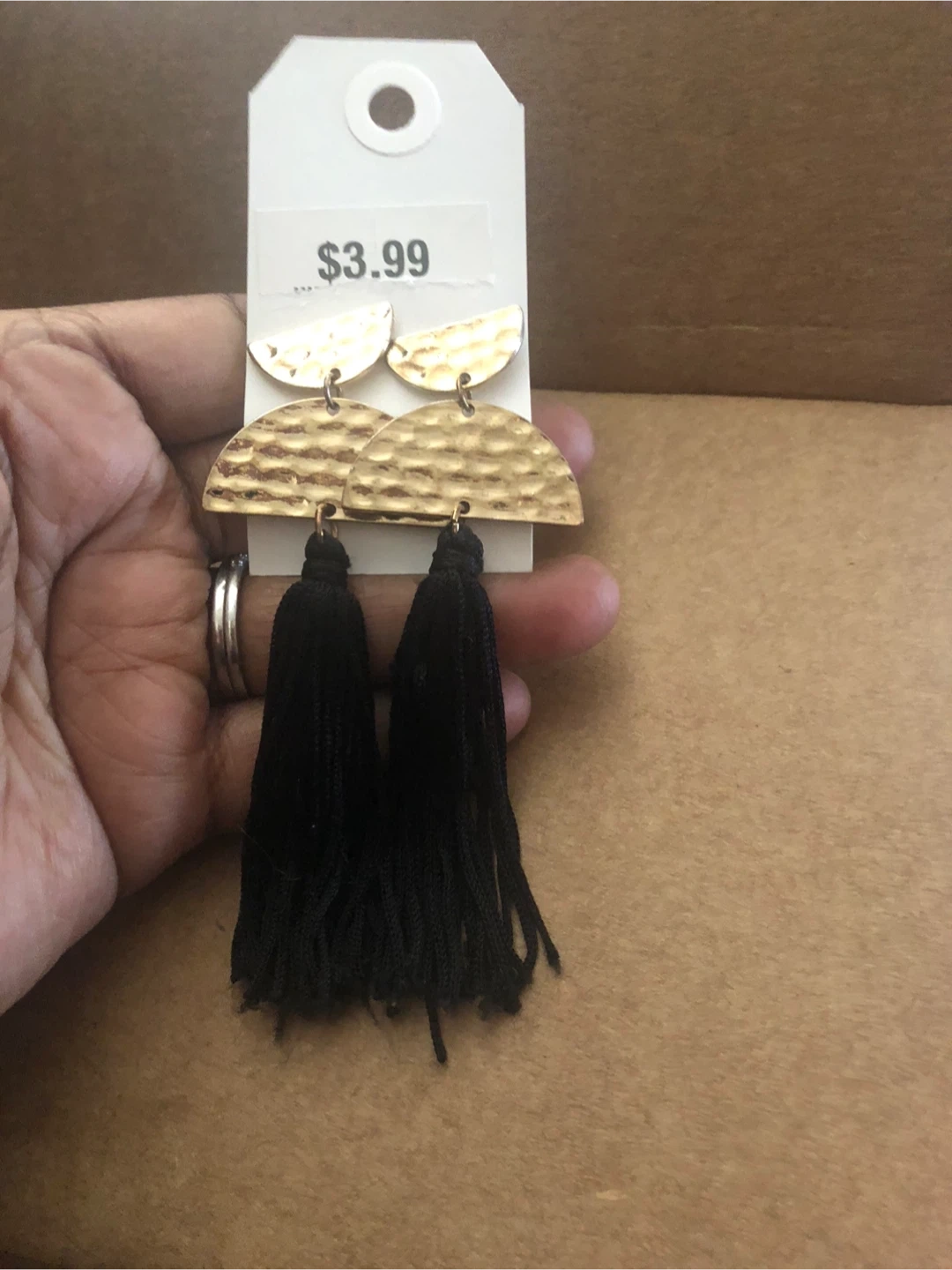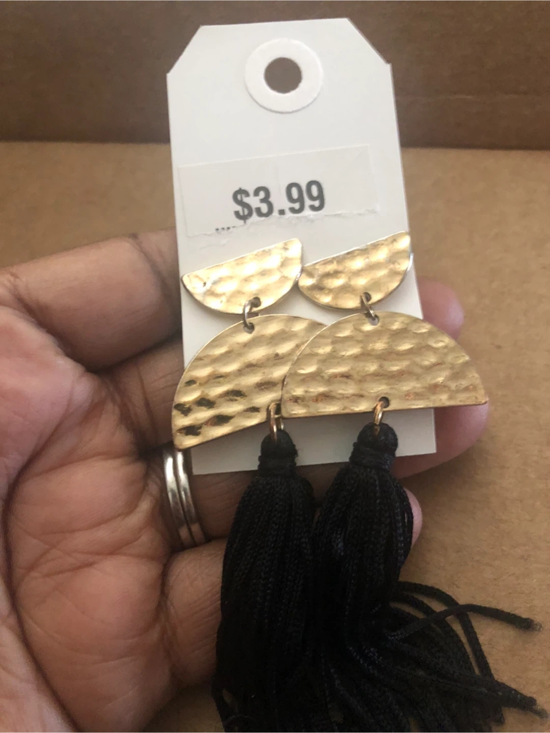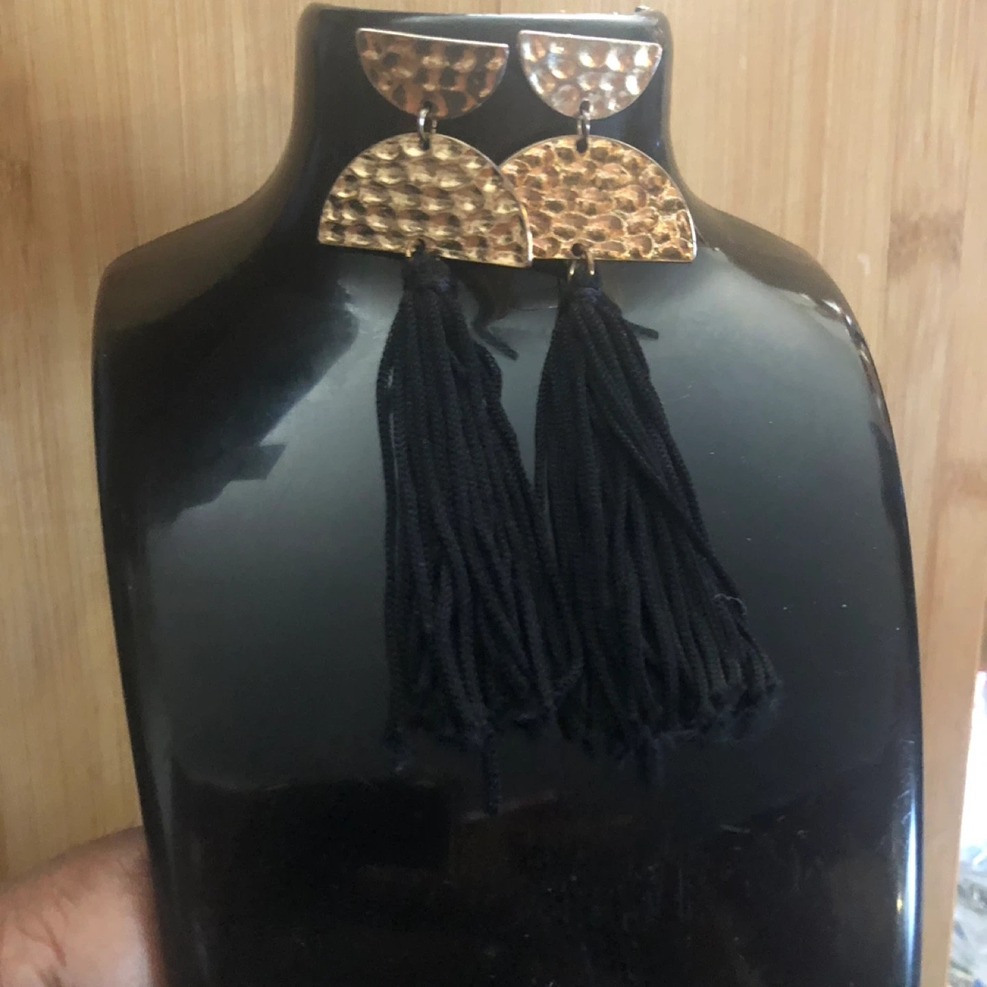 These stylish earrings feature hammered gold-tone half-moon tops with black tassel drops. They're lightweight and add a touch of flair to any outfit. Perfect for dressing up or casual wear!