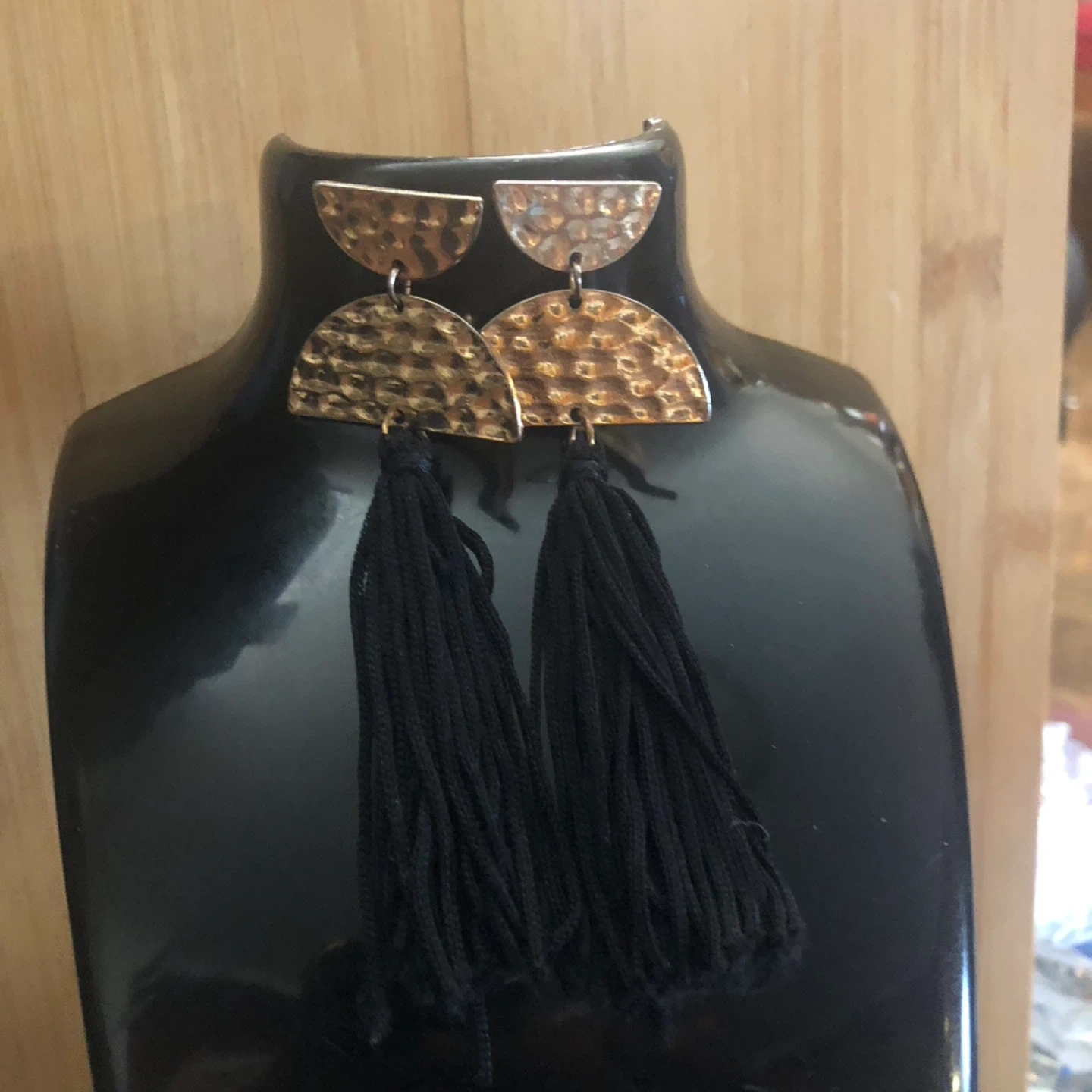 These stylish earrings feature hammered gold-tone half-moon tops with black tassel drops. They're lightweight and add a touch of flair to any outfit. Perfect for dressing up or casual wear!