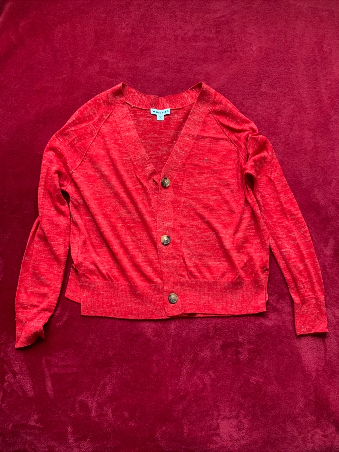 Buy & Sell🧡 Button-Up Cardigan by Whistles🧡 Button-Up Cardigan by Whistles$5This is a red button-up cardigan sweater from Whistles - well known European brand. Made from 75% acrylic, 14% linen, and 11% polyamide. Size SConditionGoodSizeSBrandWhistlesWHERE TO MEETCheck LocationView MapSELLERverifiedNadiaPark Hill41731 reviews0 chats·0 favorites·3 viewsSEND CHAT TO SELLERHi Nadia! I’m interested in your listing.Hi Nadia! I’m interested in your listing.Get the Karrot app to chatSign In to chat