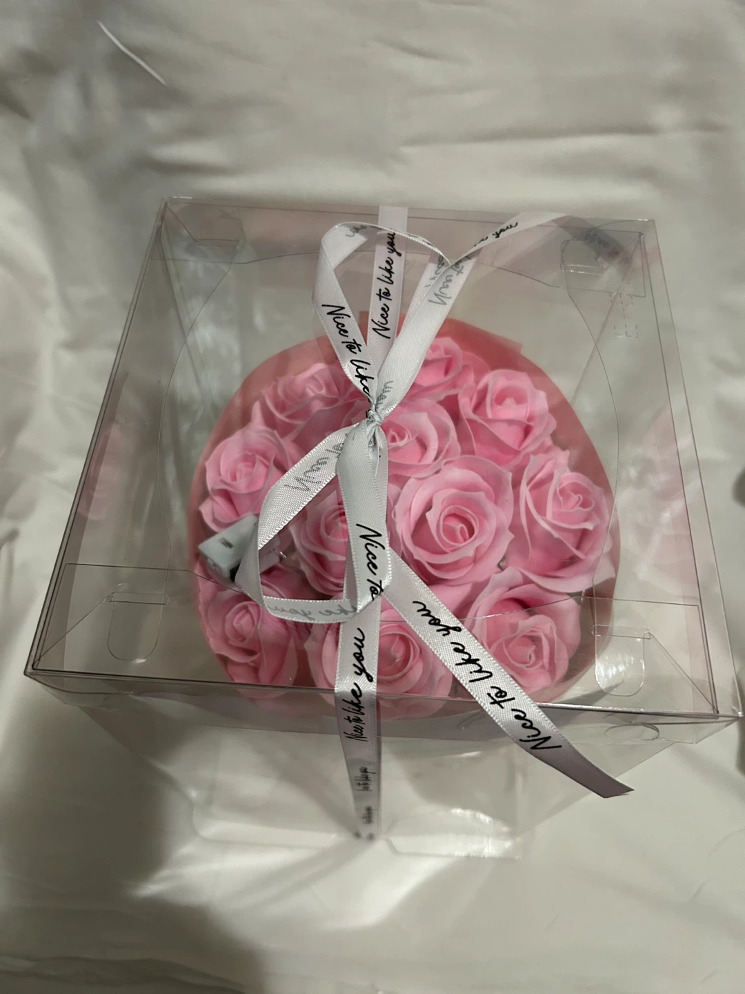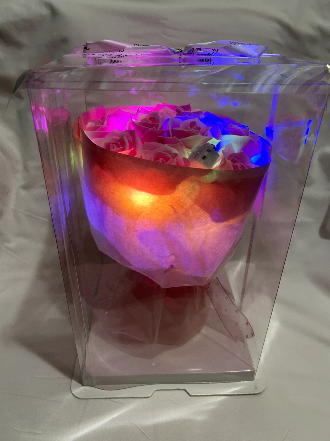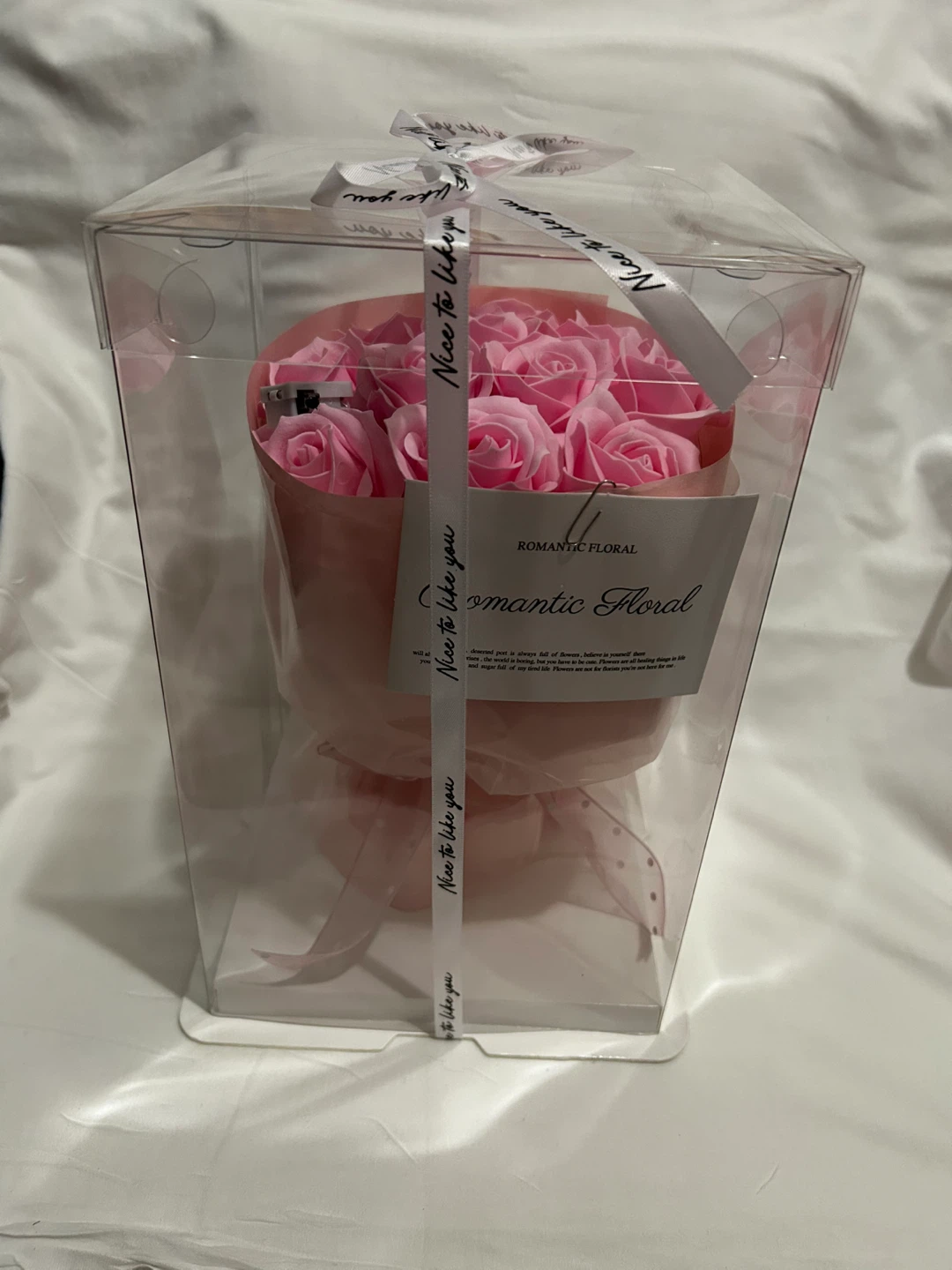 This is a romantic floral bouquet made of soap flowers. It comes with decorative lights for a beautiful glow. The roses are pink and presented in a clear gift box.