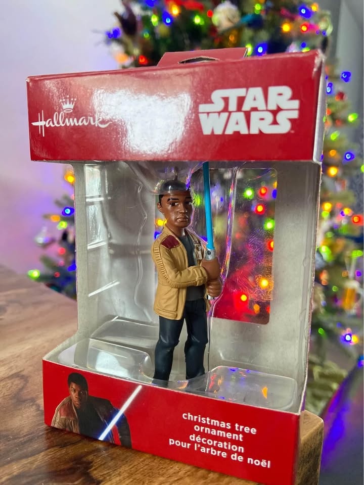 Star Wars fans will love this Christmas ornament featuring Finn wielding the legendary blue lightsaber
