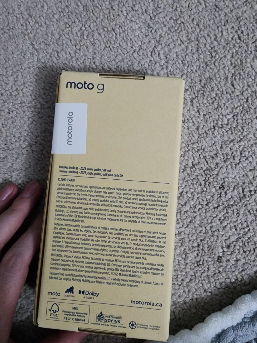 Motorola Moto G 2025 smartphone. Includes Moto G 2025, cables, guides, and SIM tool. Designed and manufactured by Motorola Mobility, a wholly owned subsidiary of Lenovo.