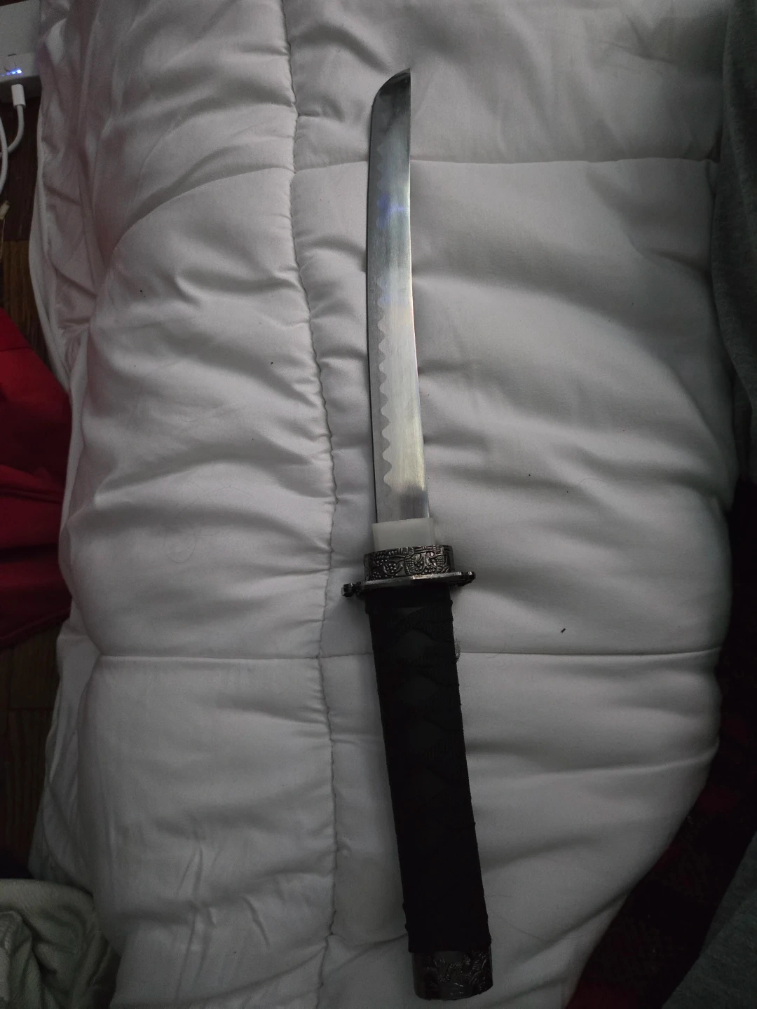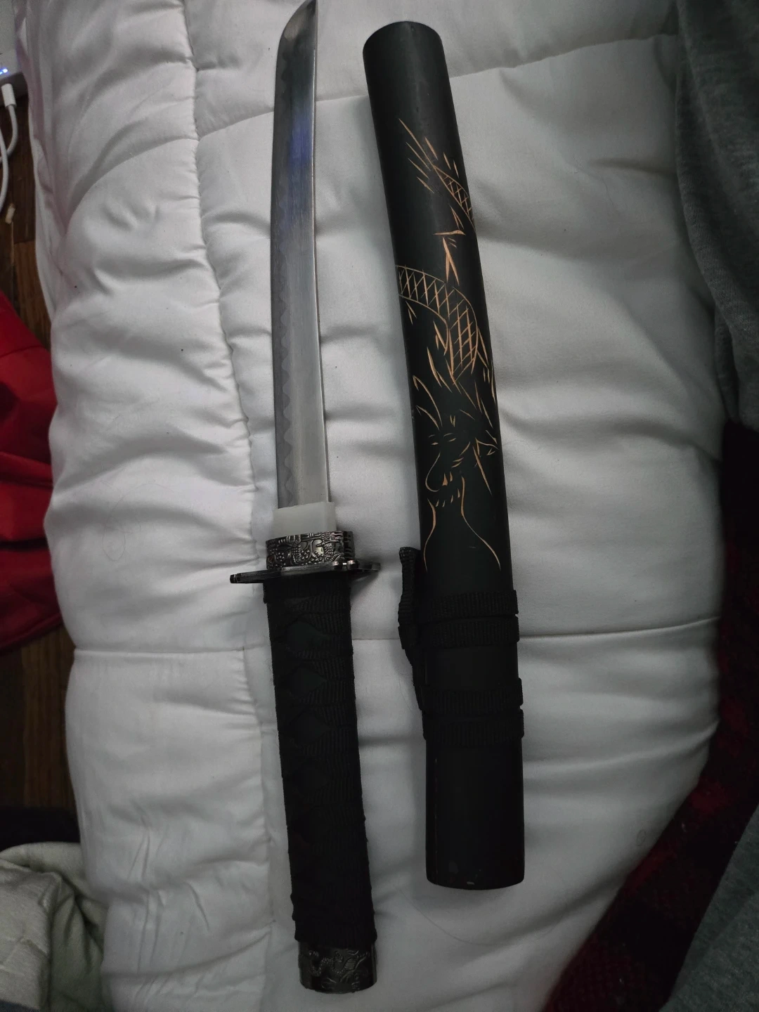 This decorative katana features a metal blade and a black handle wrapped for grip. It comes with a black scabbard decorated with a dragon motif. A cool display piece!