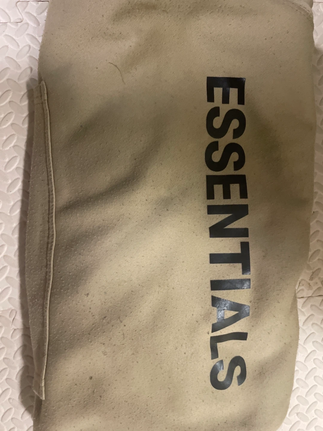 Selling a beige Essentials hoodie! It has the Essentials logo on the front and the sleeve. It's in good condition and ready for a new owner