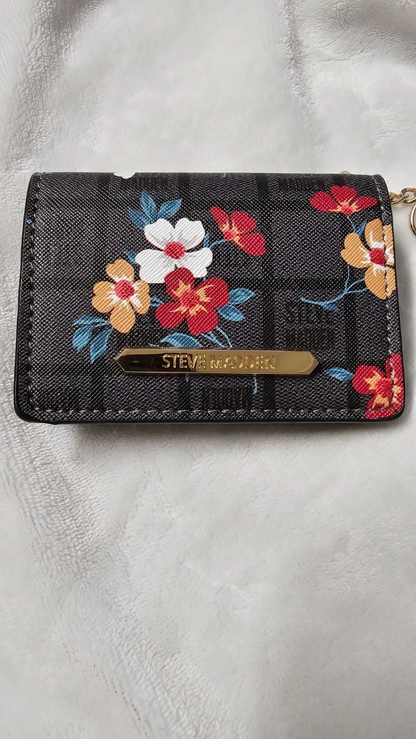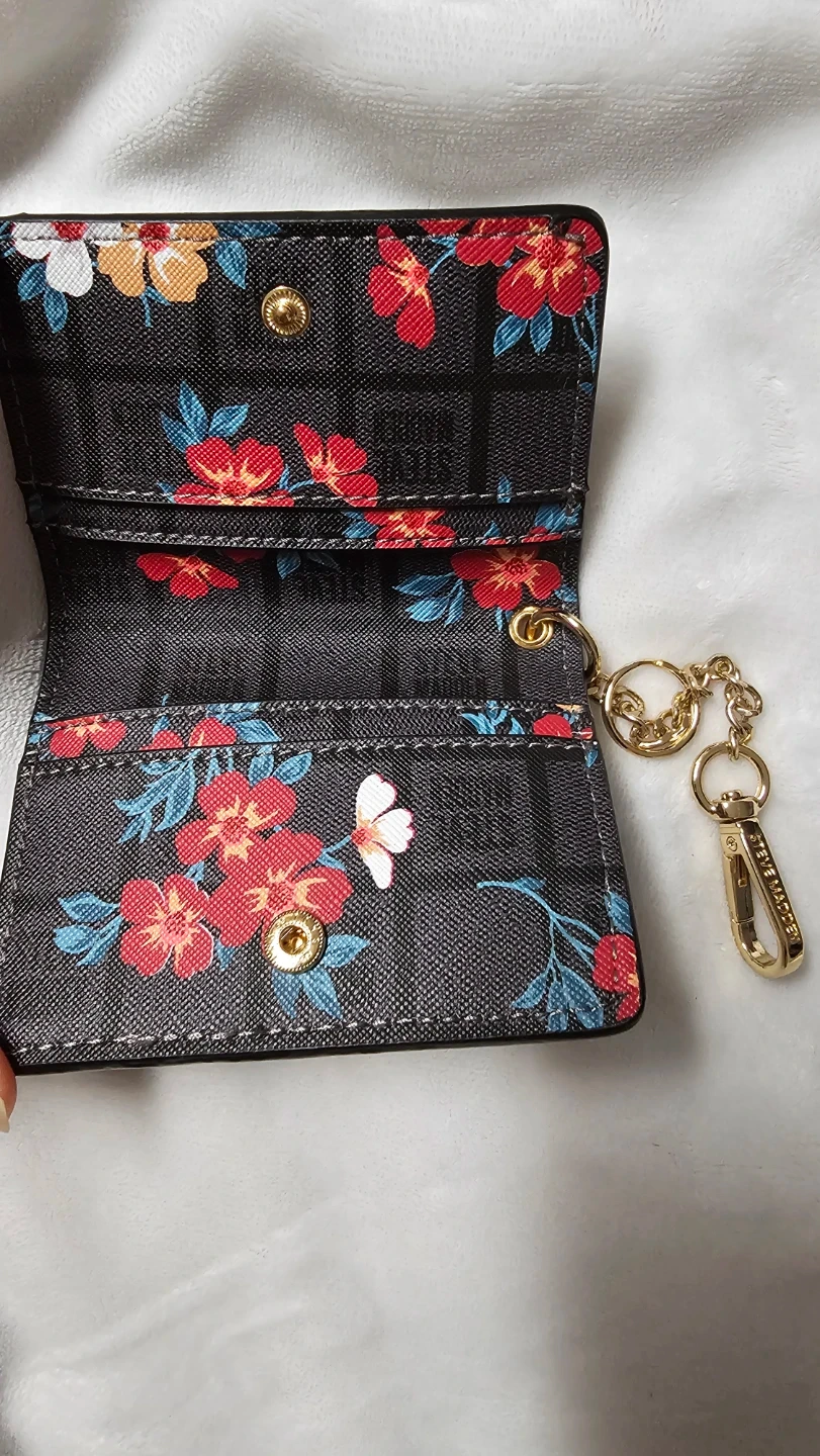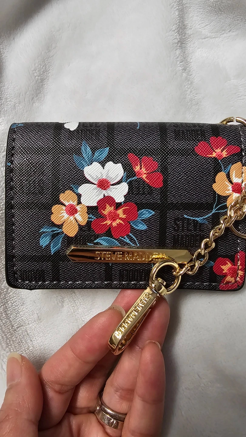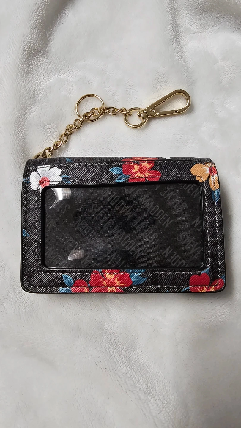 This is a Steve Madden card holder featuring a black background with a vibrant floral print. It includes a clear ID window on the front and a secure snap closure. A gold-tone chain and clip are attached for convenience. Perfect for keeping your essential cards handy!
