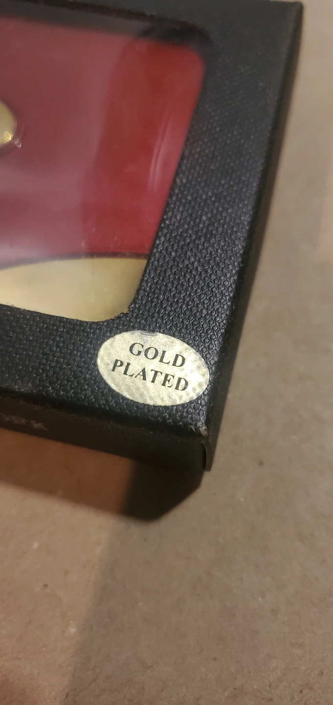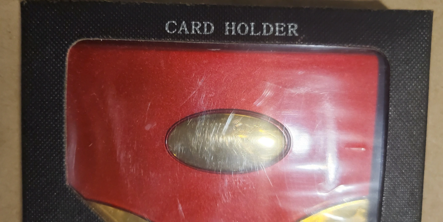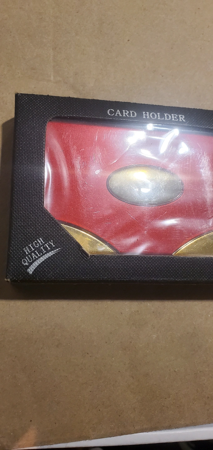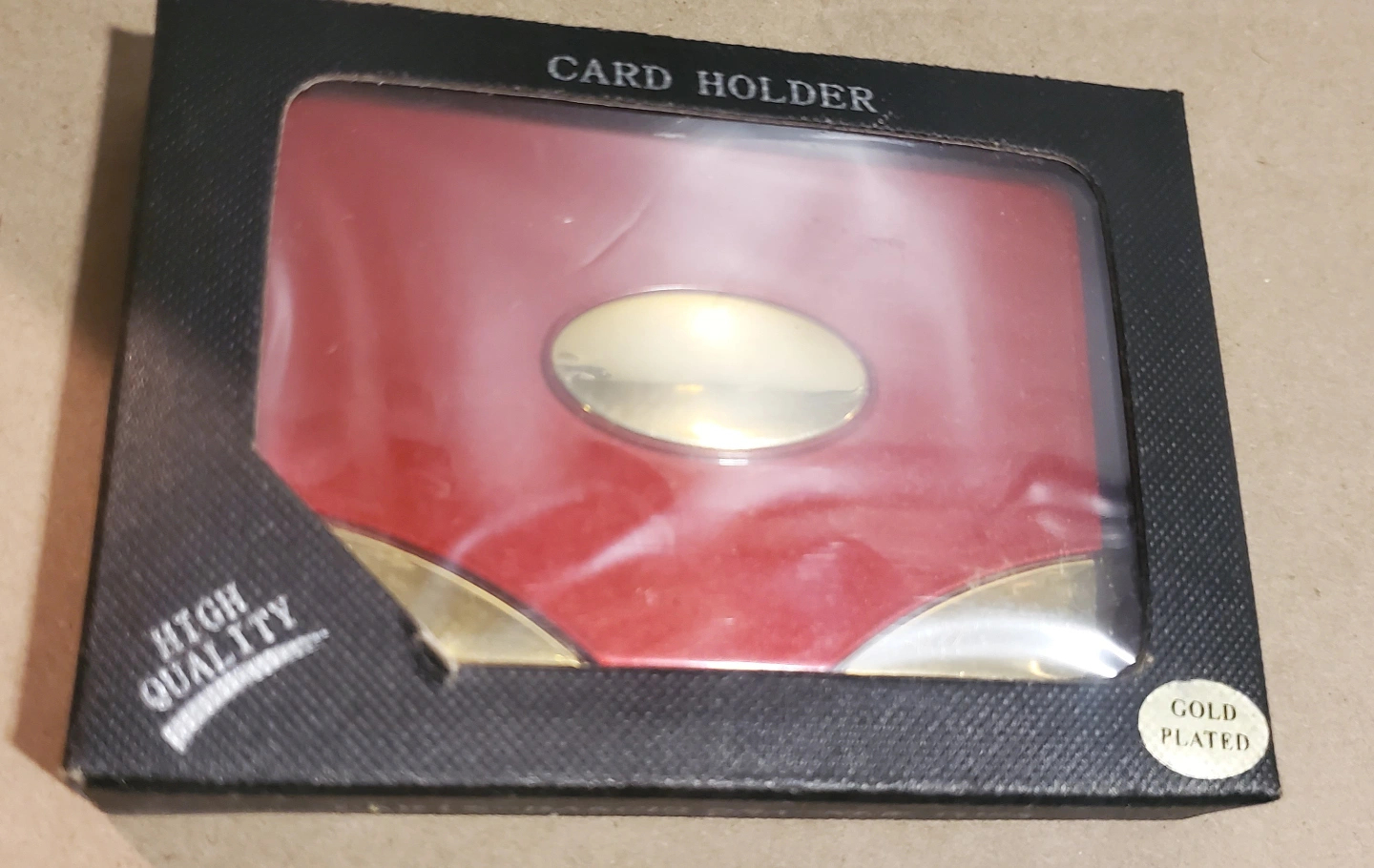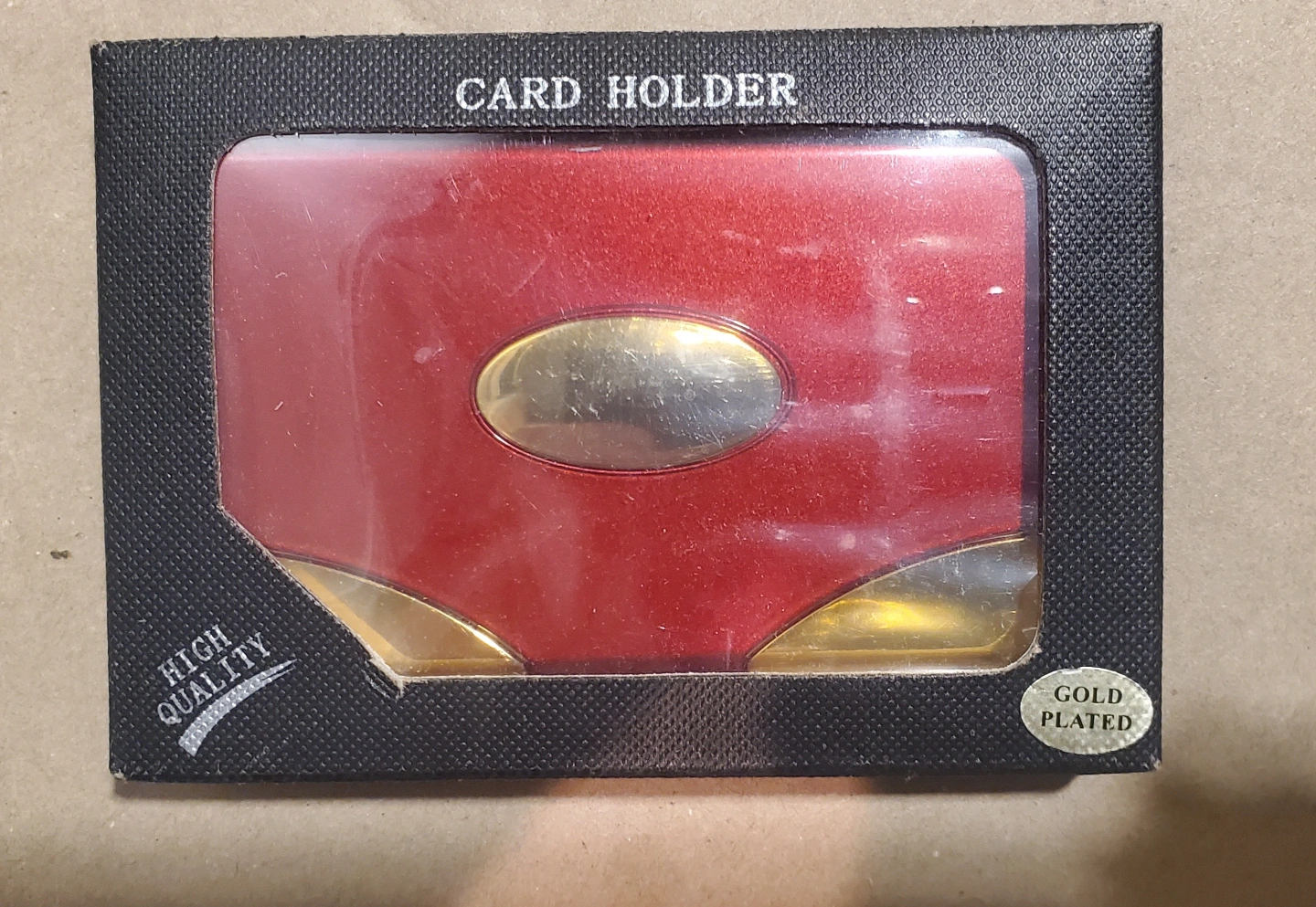 New red card holder. Gold-plated accents. High-quality materials. Compact design. Perfect for storing business cards.