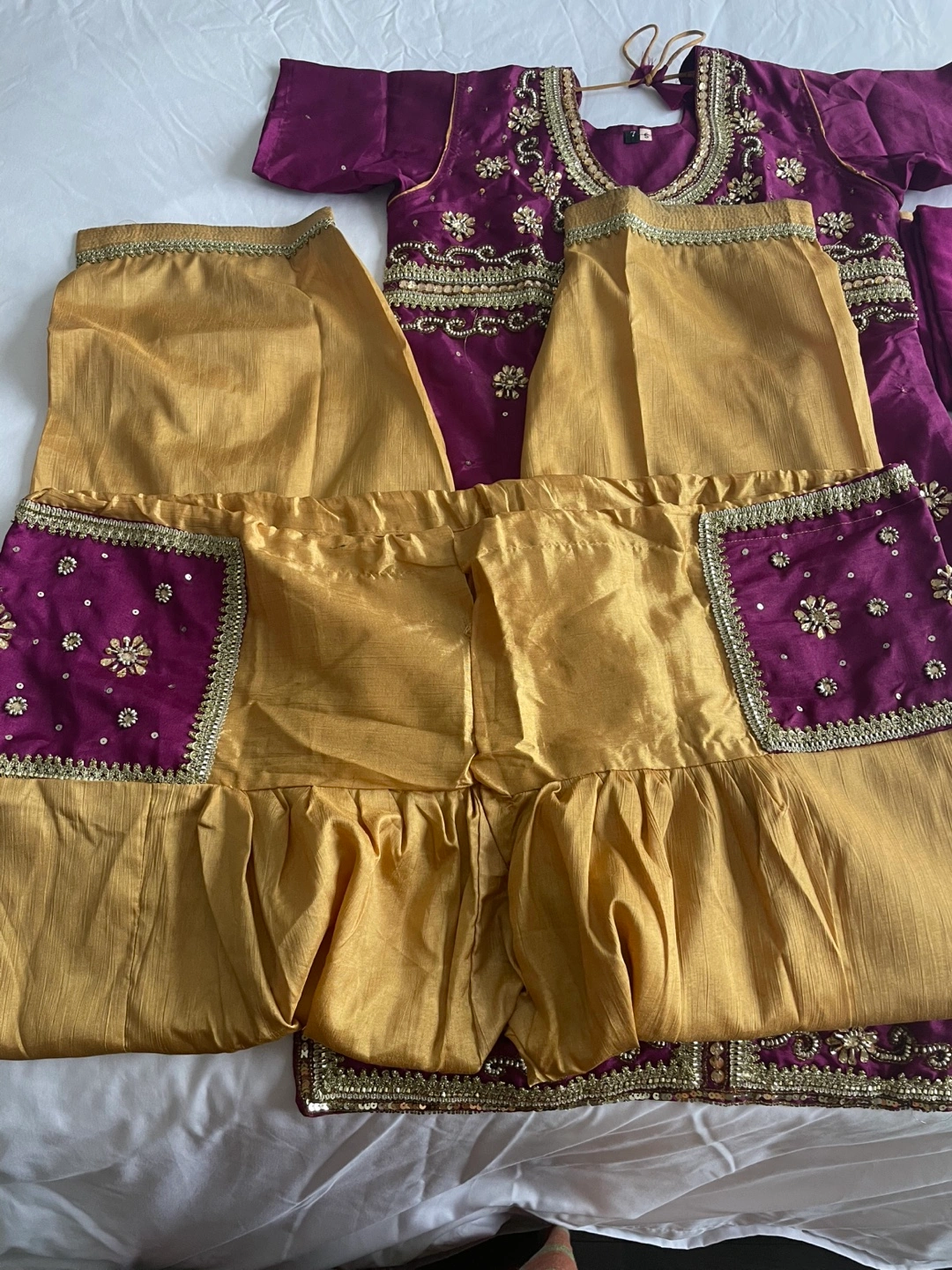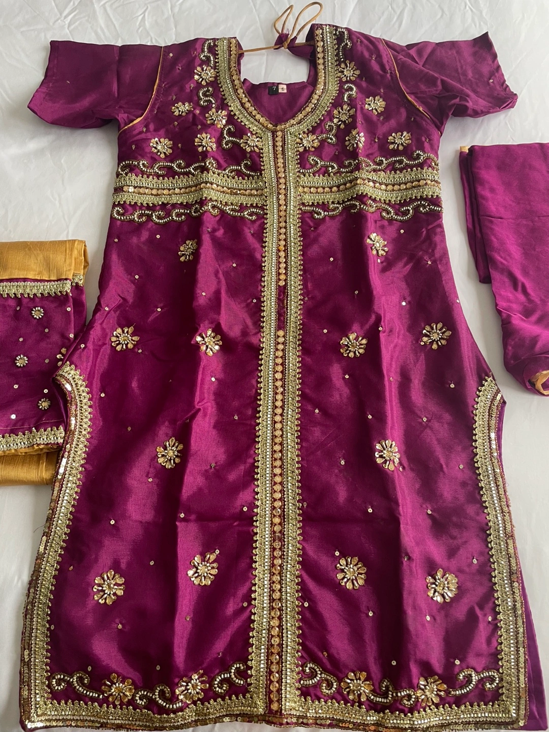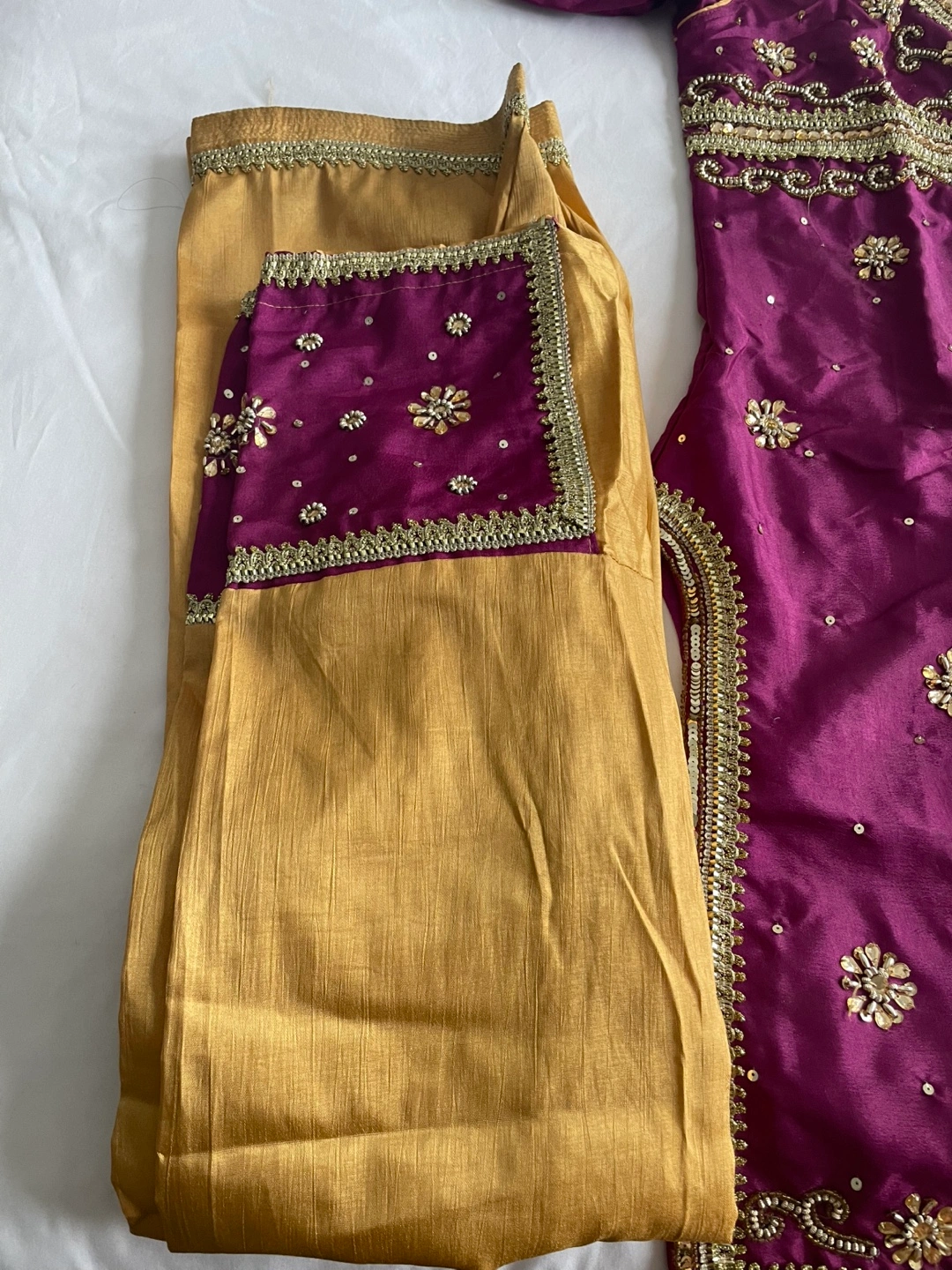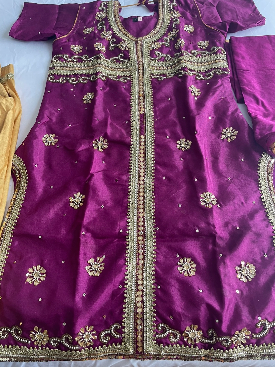Purple and gold salwar kameez suit. Embroidered with sequins and beads. Comes with a dupatta.