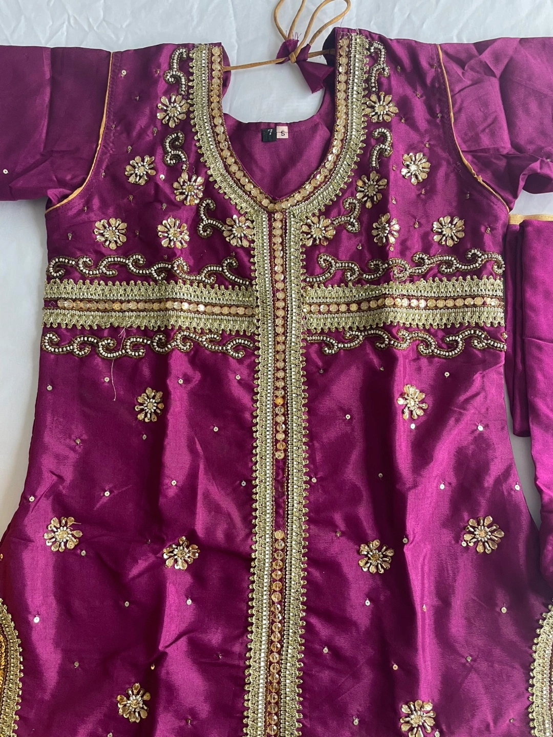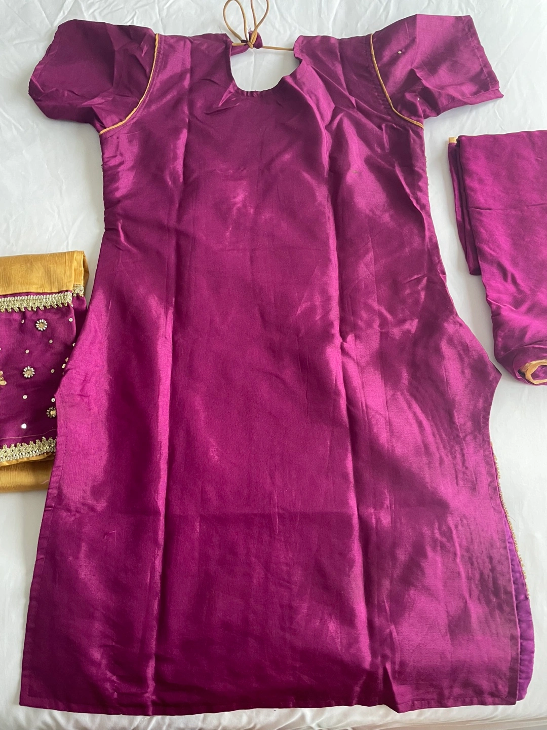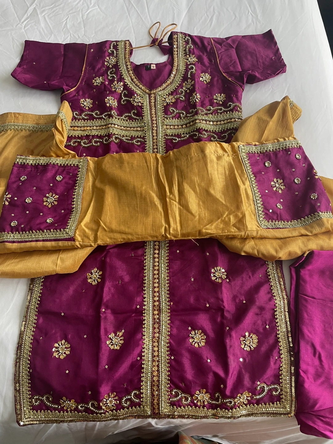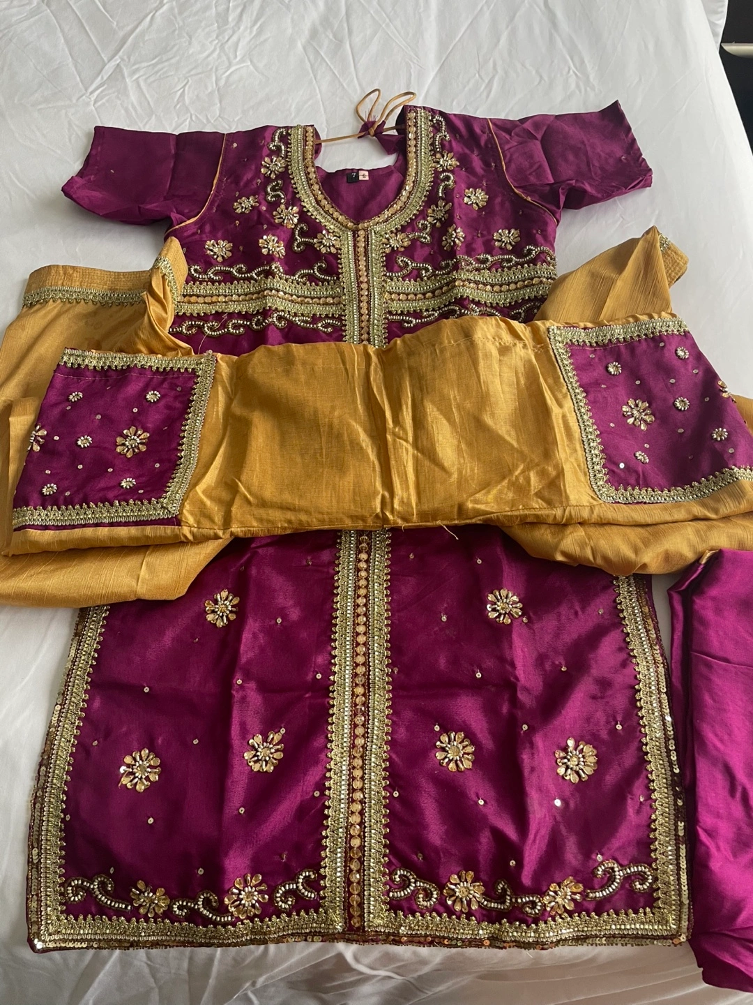 Purple and gold salwar kameez suit. Embroidered with sequins and beads. Comes with a dupatta.