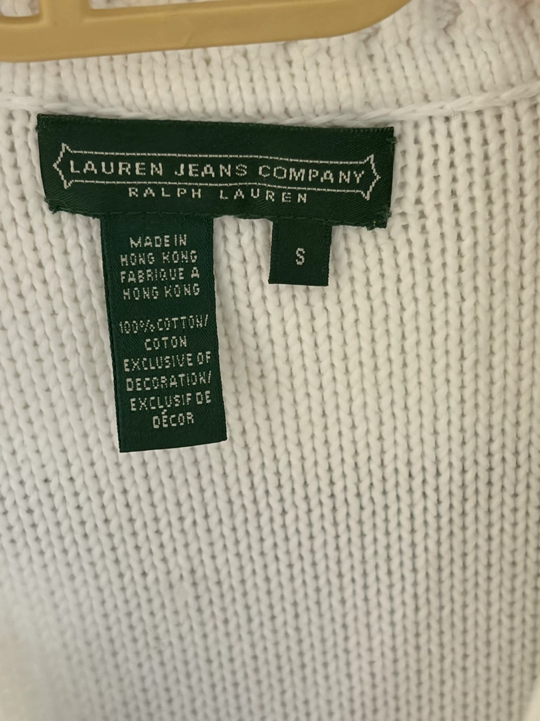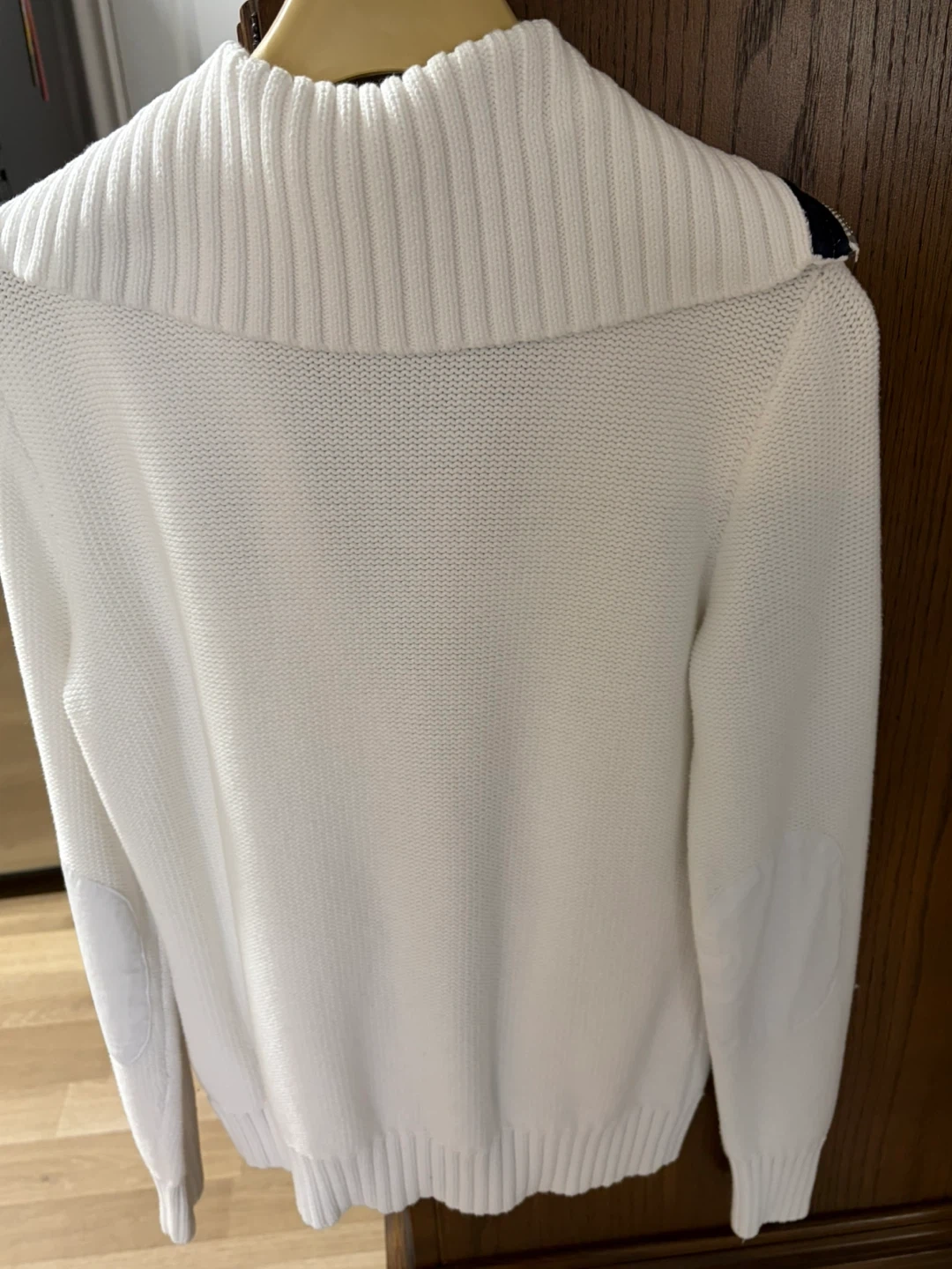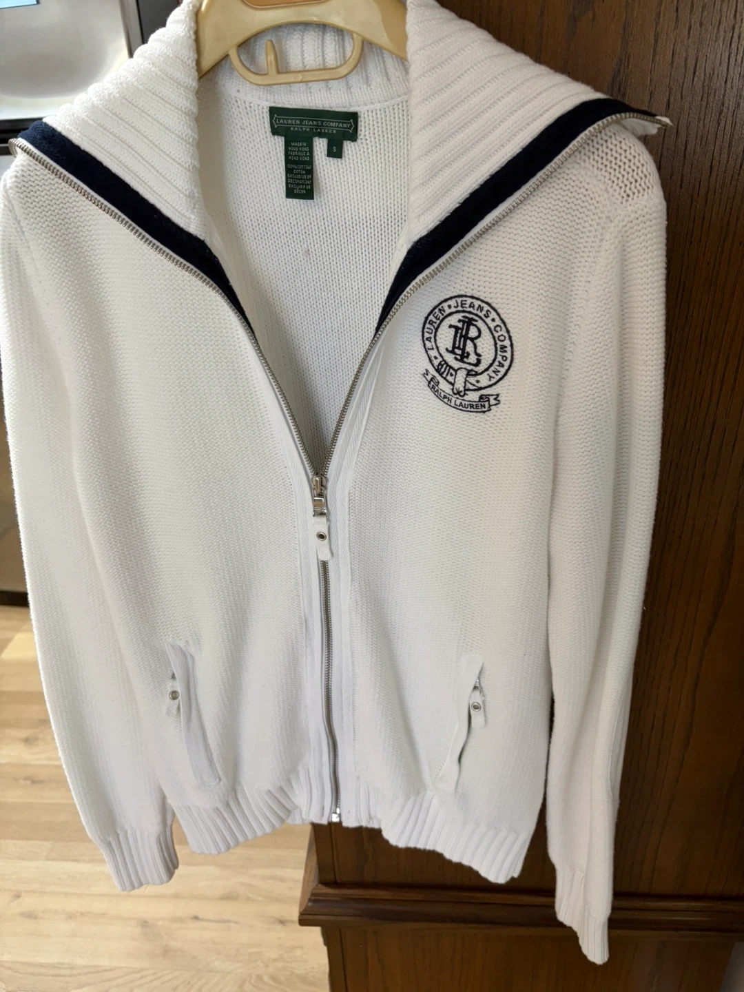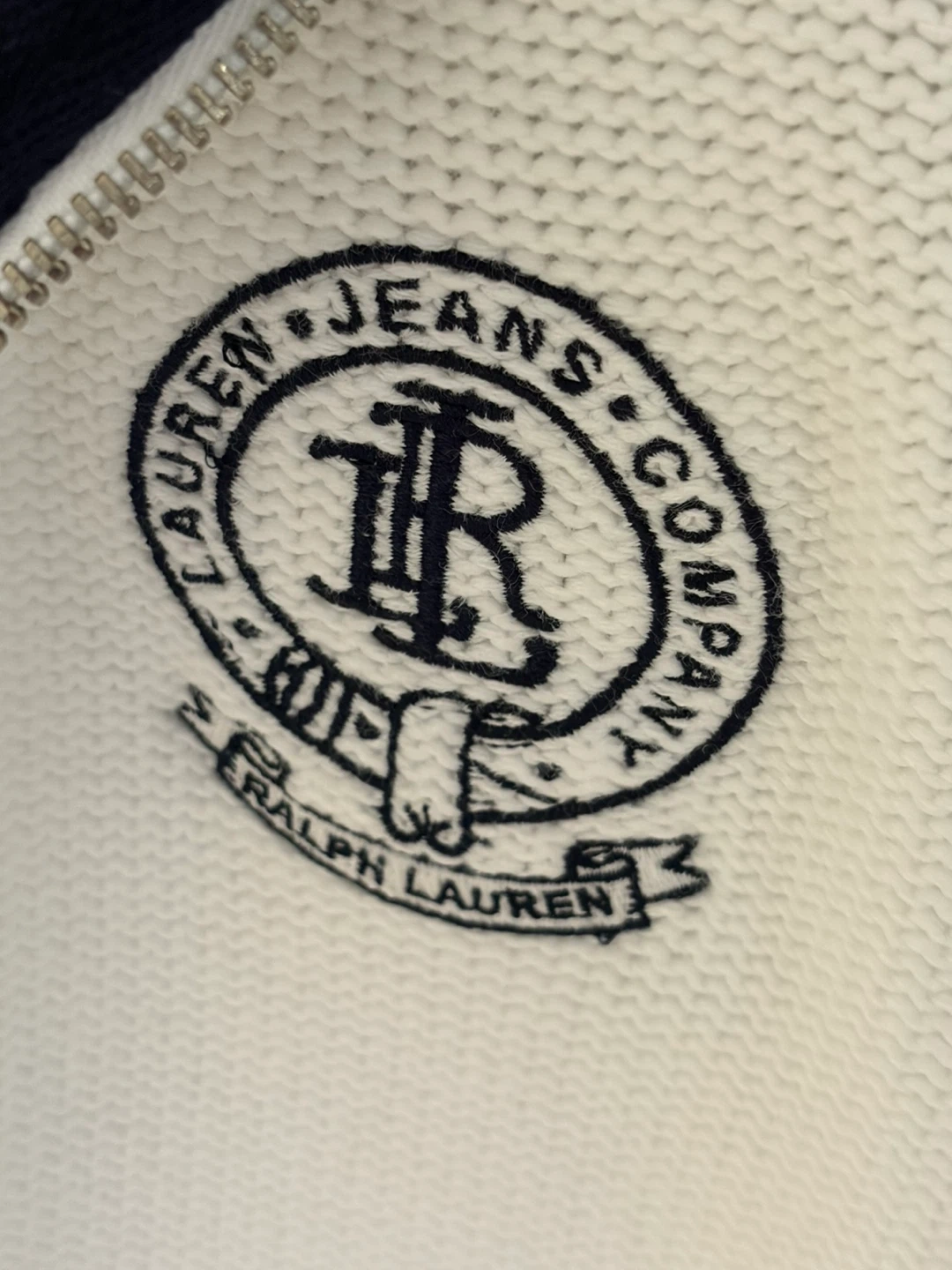 Ralph Lauren Jeans Company zip-up sweater. 2 side pockets with zippers. Made of 100% cotton. Features elbow patches and a shawl collar.