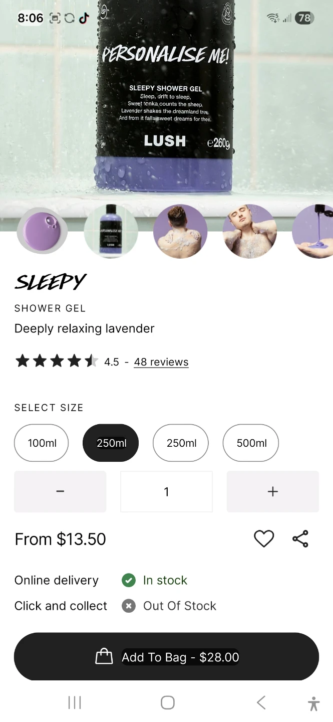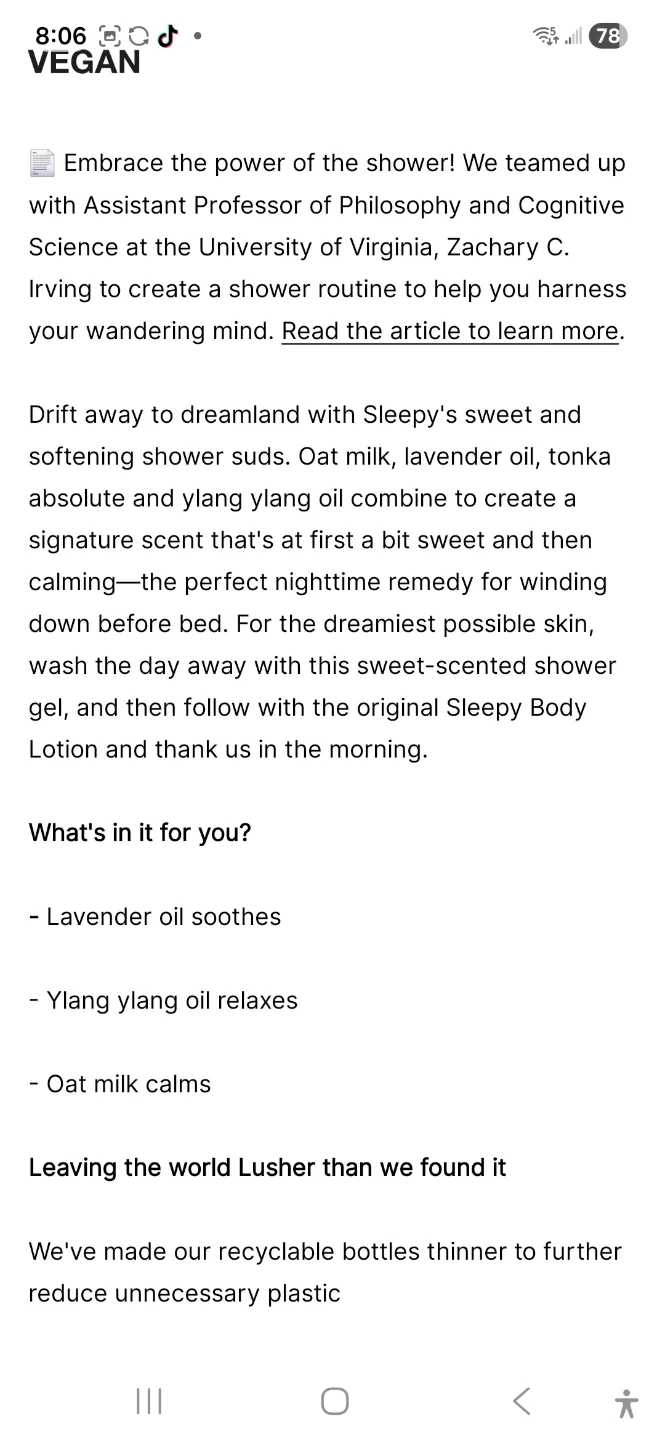 Lush Sleepy Shower Gel in a 250ml bottle. It's made with lavender oil, oat milk, and ylang ylang oil. This deeply relaxing shower gel is perfect for winding down before bed.