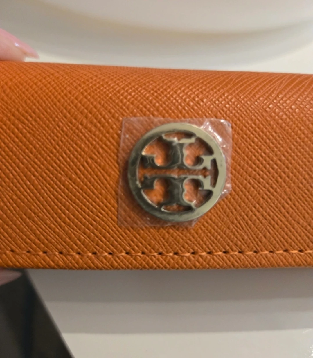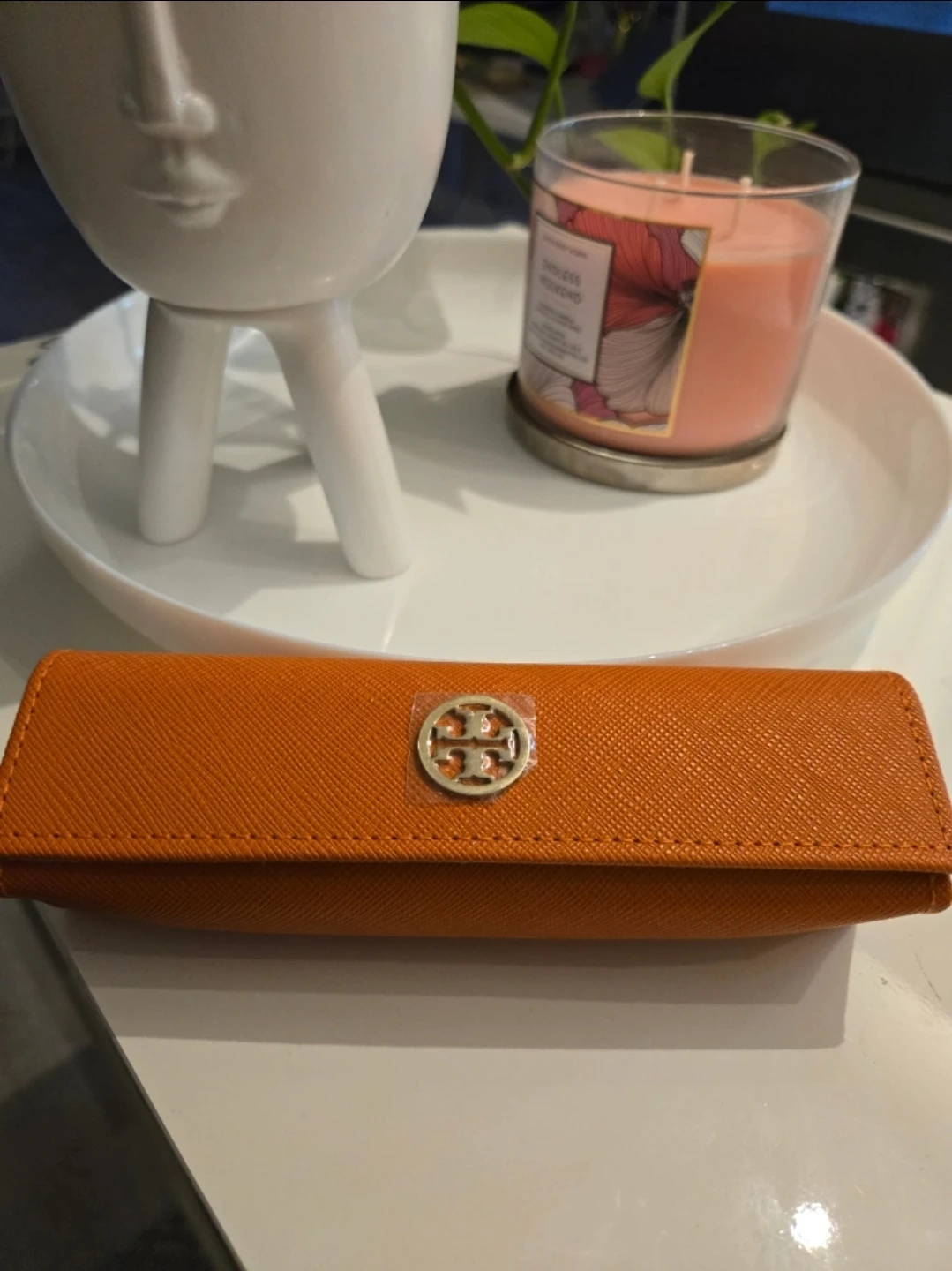 NEW! Tory Burch eyeglass case in a vibrant orange colour. It's made from saffiano leather with a soft interior lining. Magnetic snap closure keeps your glasses secure!