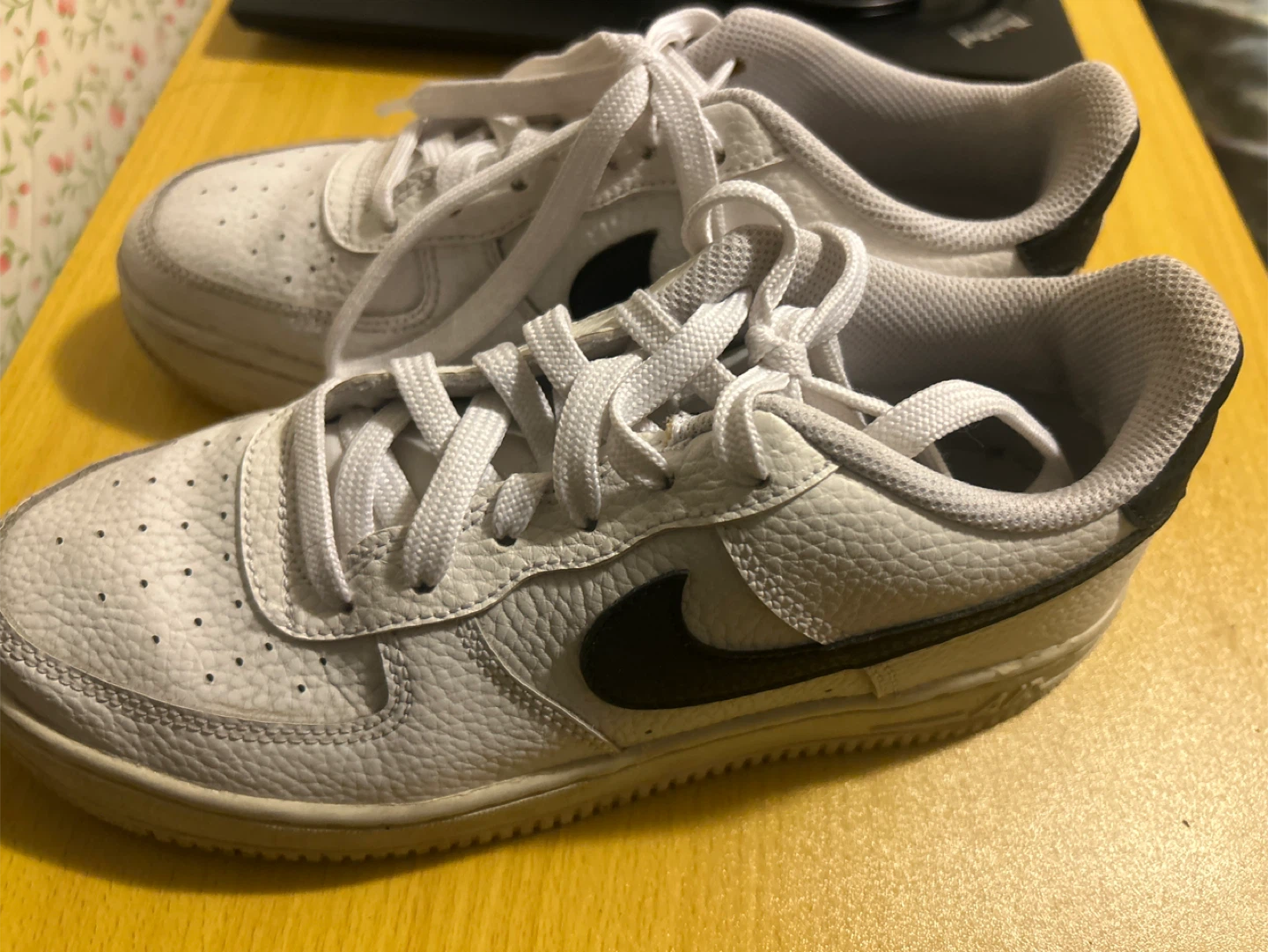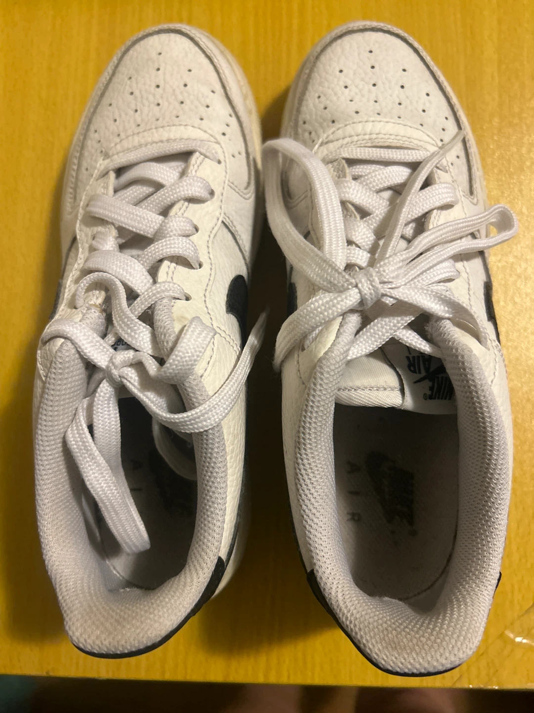 White leather Nike Air Force 1 sneakers. Classic lace-up style with a durable rubber sole. These are great for everyday wear. They're comfortable and versatile!