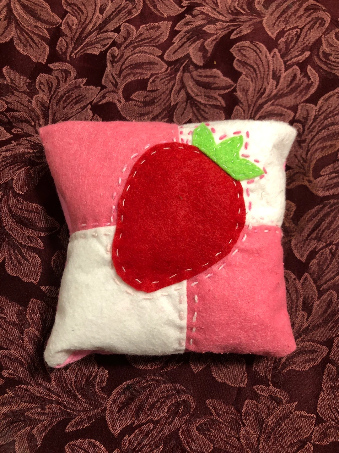 This is a pink and white patchwork felt decorative pillow I made recently. Im trying to make some space so I will be getting rid of it.