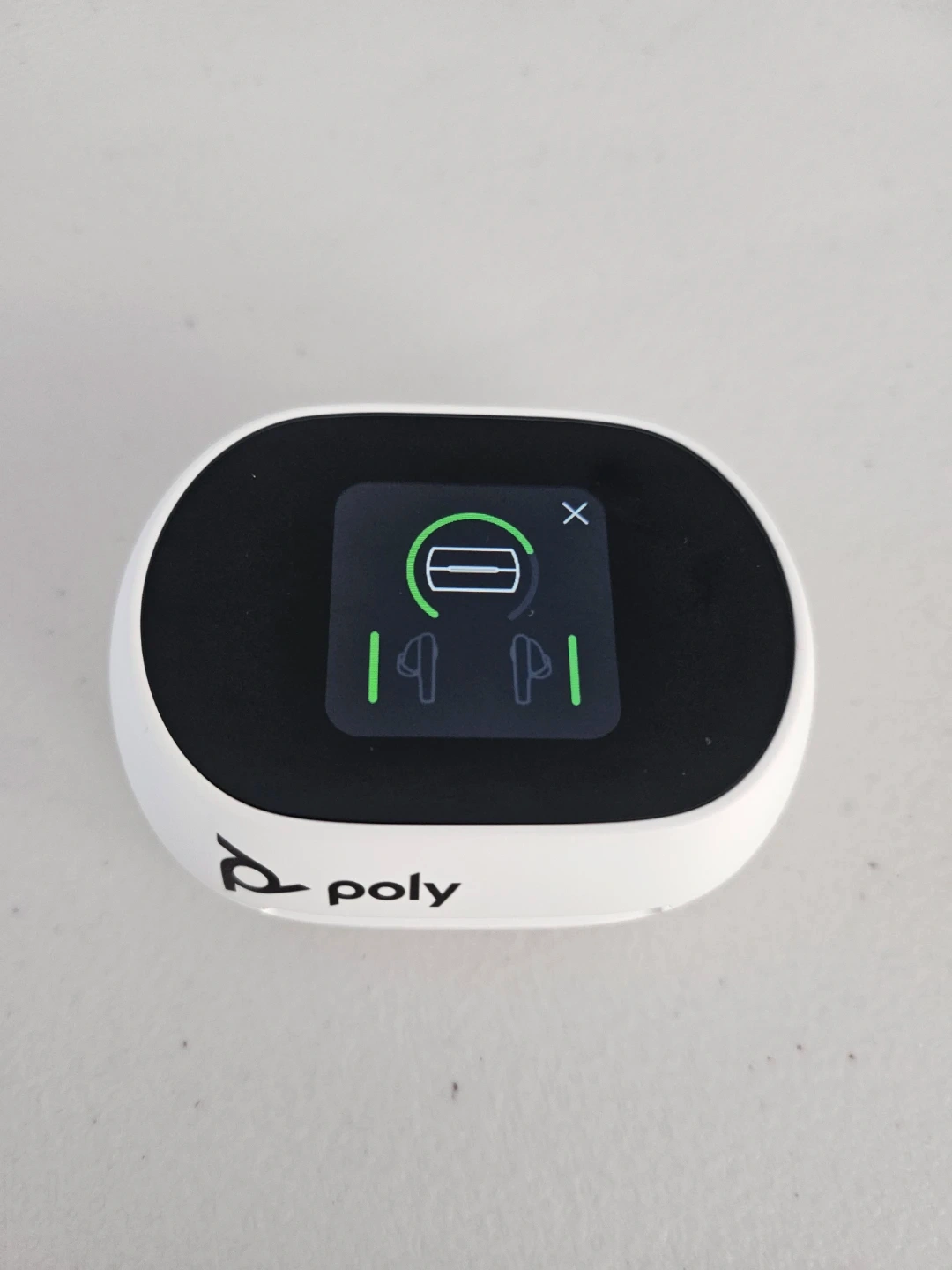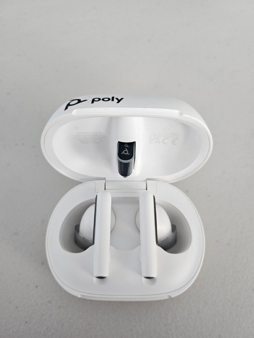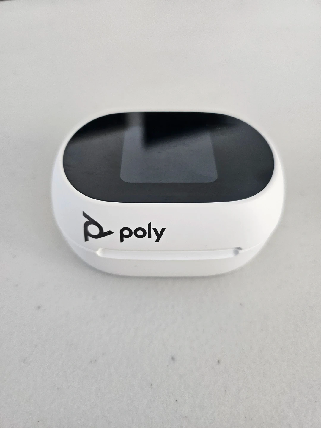 Poly Voyager Free 60+ earbuds in white. Includes the touchscreen charging case. These wireless earbuds offer clear audio for calls and music. Case has a USB-C charging port.