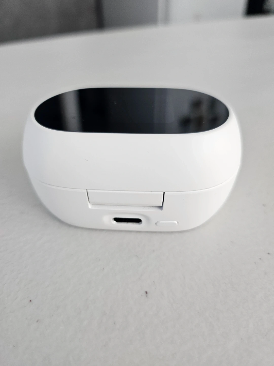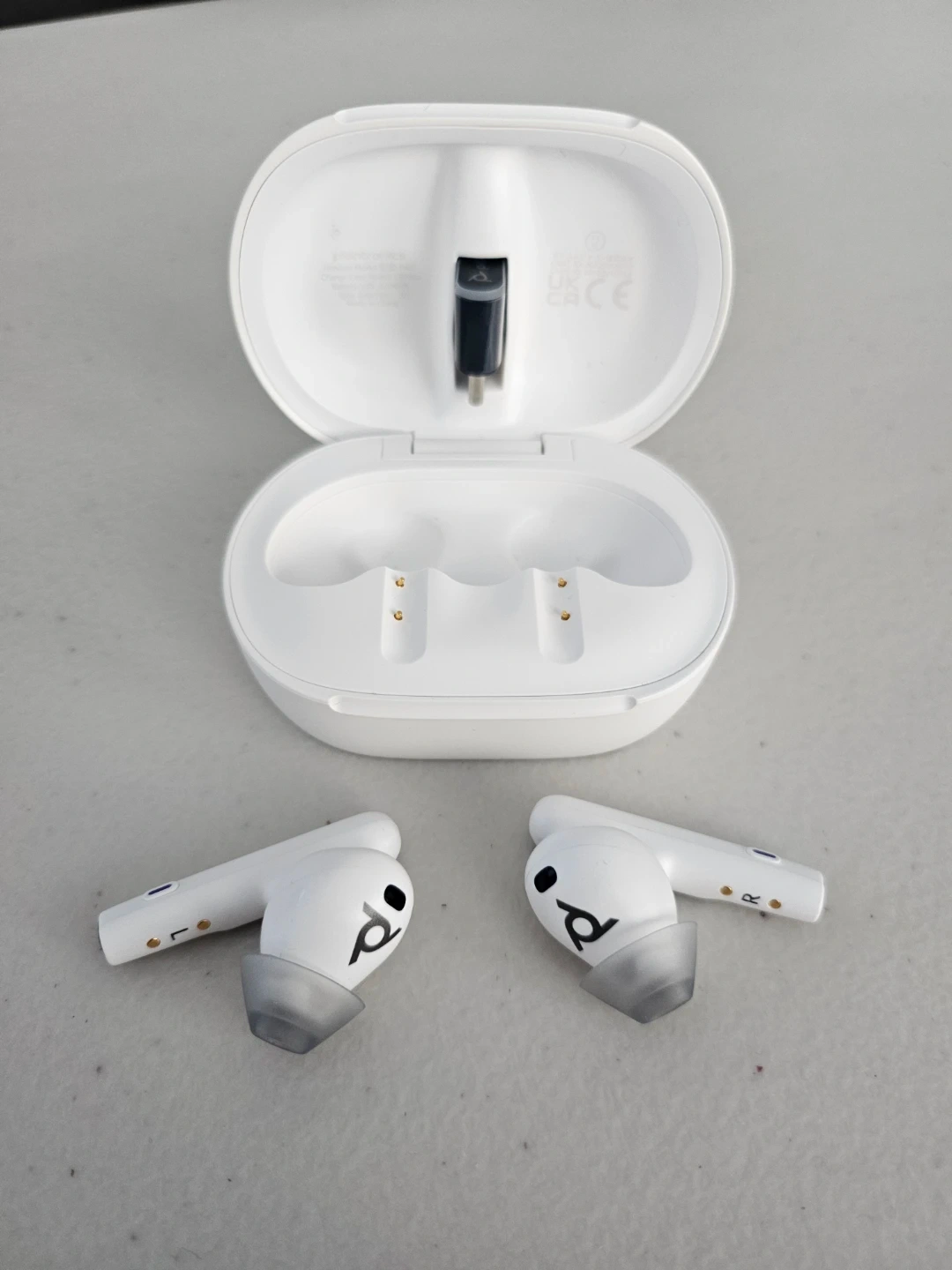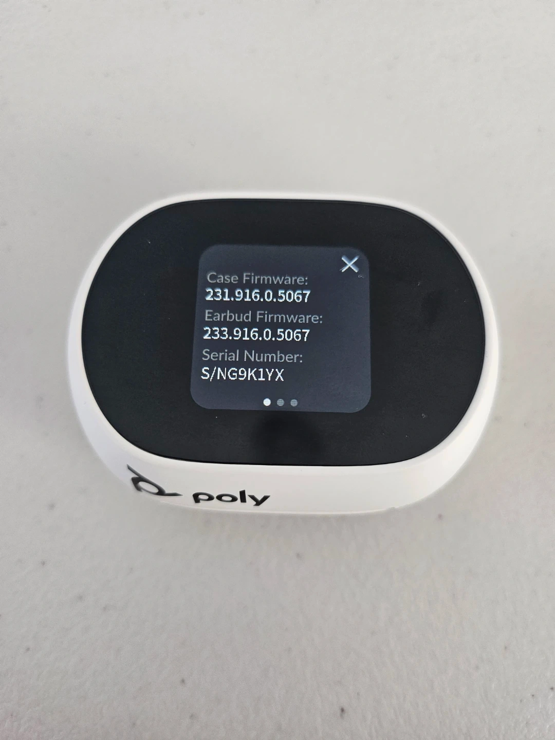 Poly Voyager Free 60+ earbuds in white. Includes the touchscreen charging case. These wireless earbuds offer clear audio for calls and music. Case has a USB-C charging port.