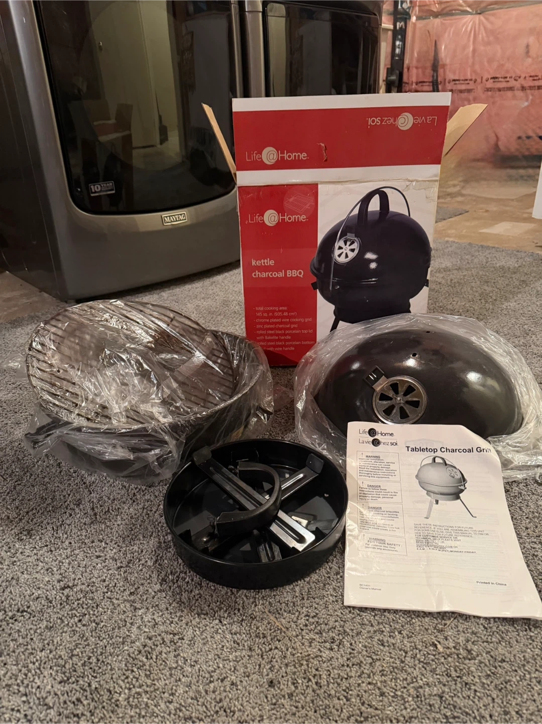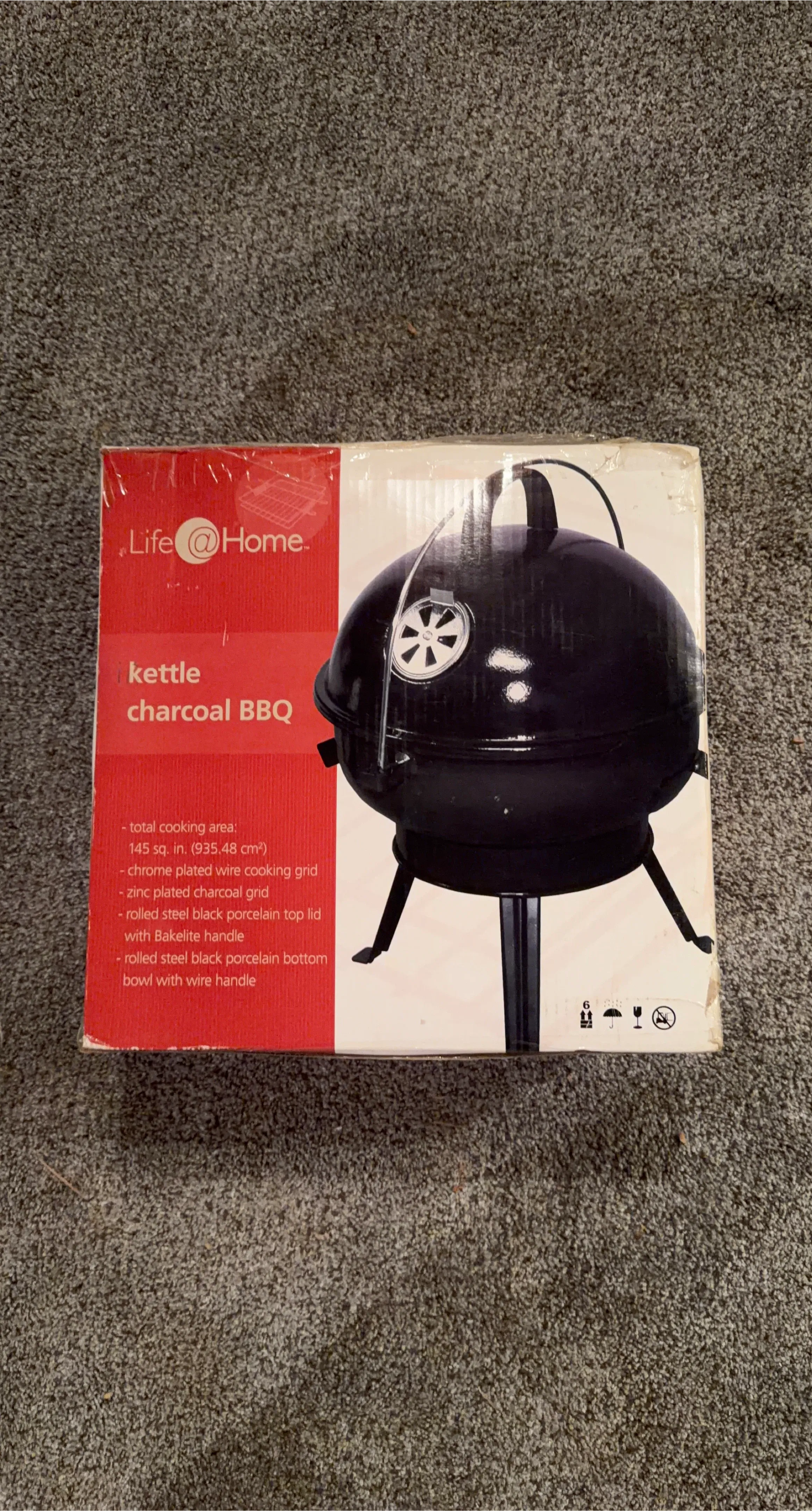 This Life @ Home kettle charcoal BBQ grill has a total cooking area of 145 sq. in. It features a chrome-plated wire cooking grid and a zinc-plated charcoal grid. The lid is porcelain enamel with a Bakelite handle. It's great for backyard cookouts!