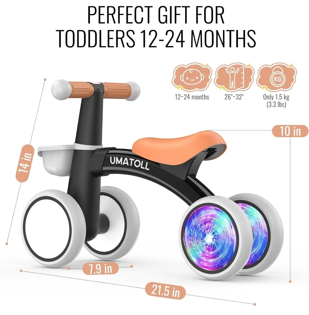 This UMATOLL balance bike is designed for toddlers aged 12-24 months. It features a 3-position adjustable seat and soft anti-slip handles for safety. The soft outside wheels are wear-resistant and won't damage floors.