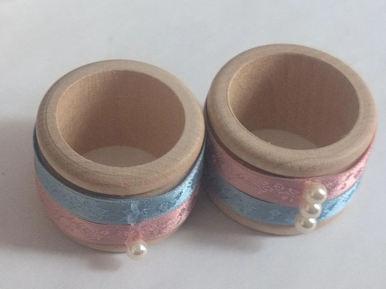 These two wooden napkin rings are adorned with light blue and pink ribbons and pearl accents. They're great for adding a decorative touch to your table setting.