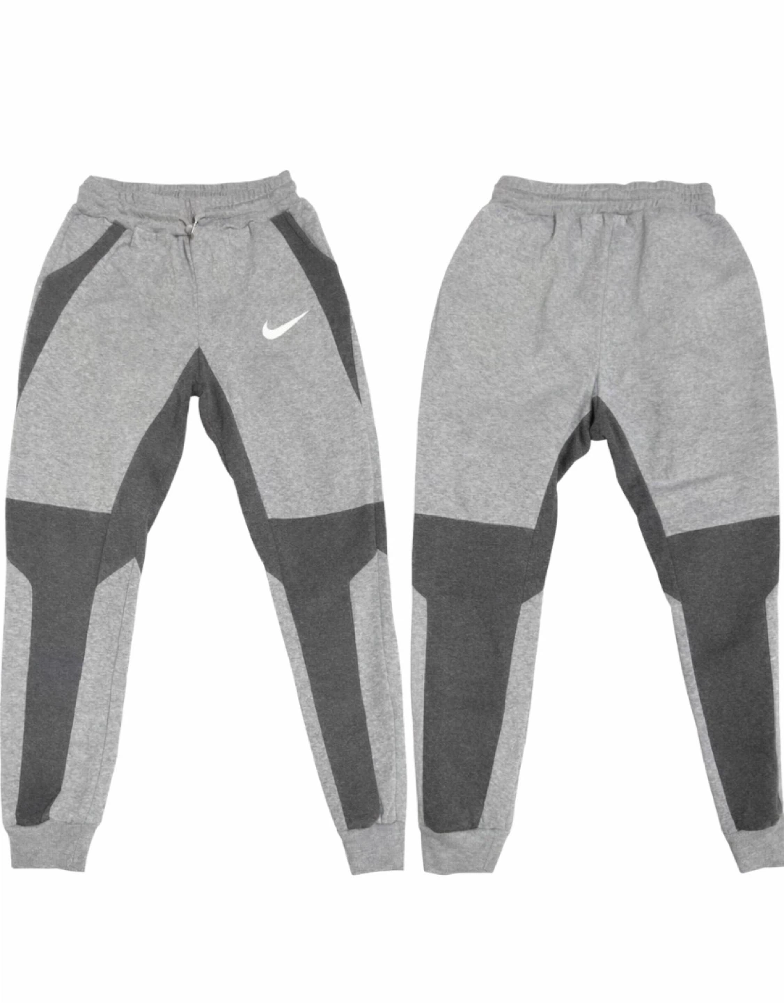 Nike Tech Fleece joggers in heather gray with dark gray paneling. Features a drawstring waist and cuffed ankles. Made from a soft, lightweight fleece fabric for warmth and comfort. (REAL BRAND). From 7-15 years old.