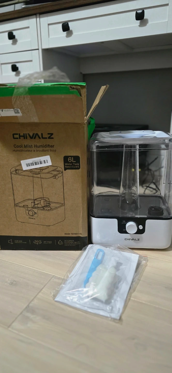 This CHIVALZ cool mist humidifier has a large 6L water tank. It comes with cleaning brushes. The unit is white and clear plastic.