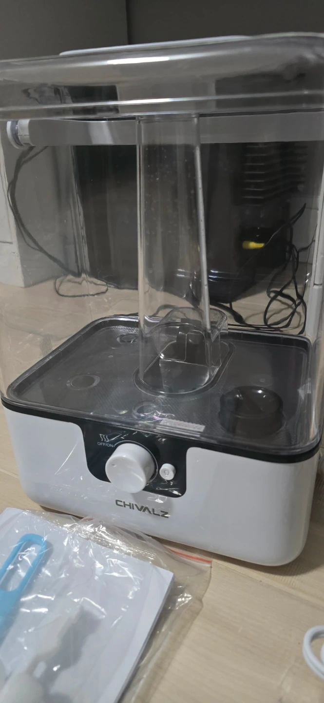 This CHIVALZ cool mist humidifier has a large 6L water tank. It comes with cleaning brushes. The unit is white and clear plastic.