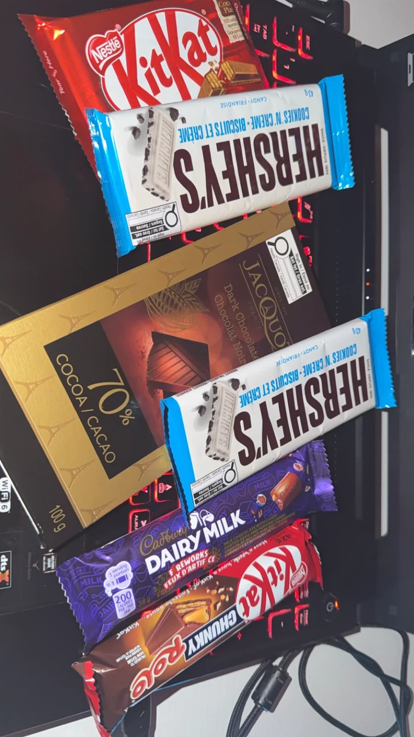 A collection of assorted chocolate bars including KitKat, Hershey's Cookies 'n' Creme, Cadbury Dairy Milk, and Jacquot Dark Chocolate. Includes a 70% cocoa chocolate bar. Plenty of treats for any sweet tooth!
