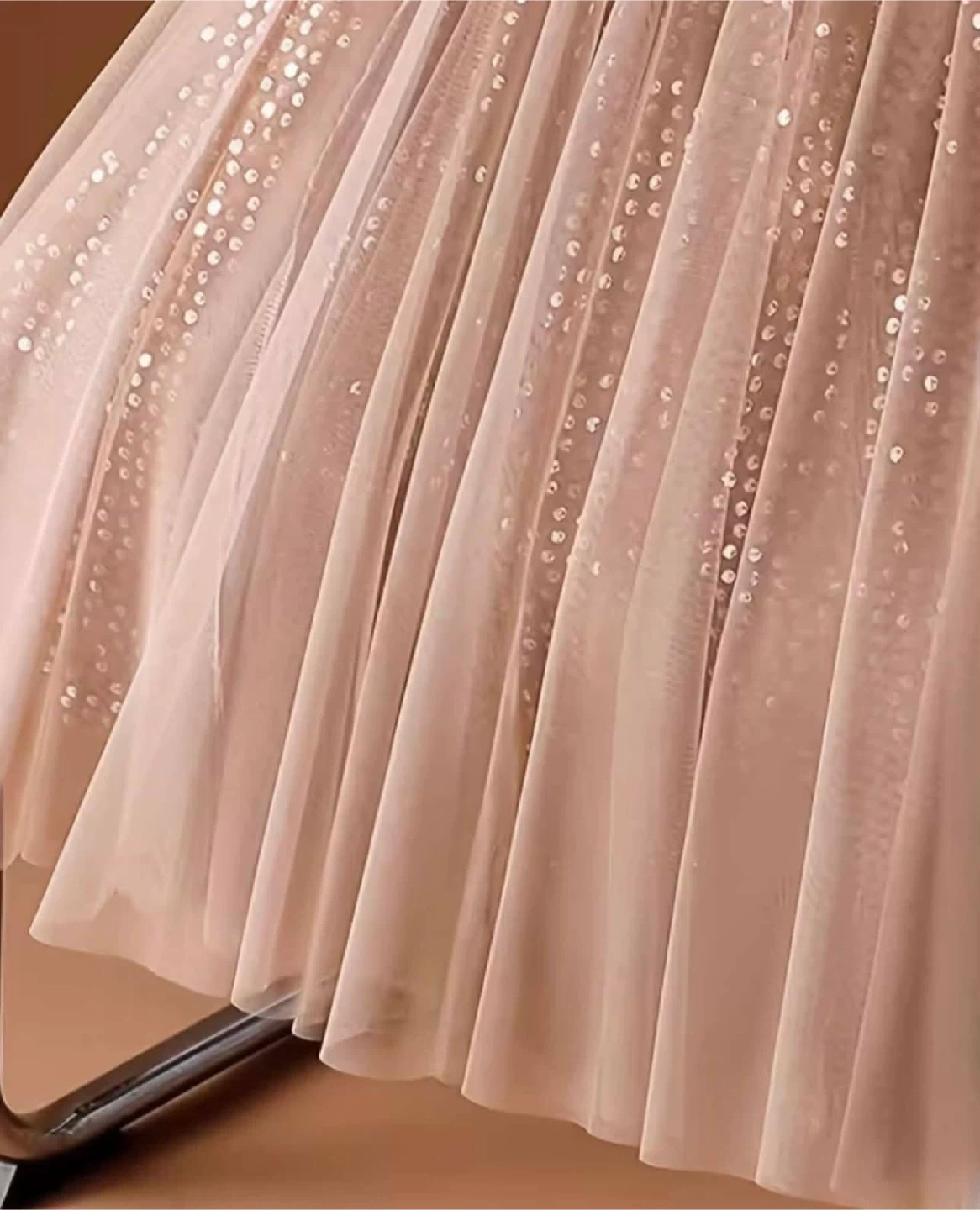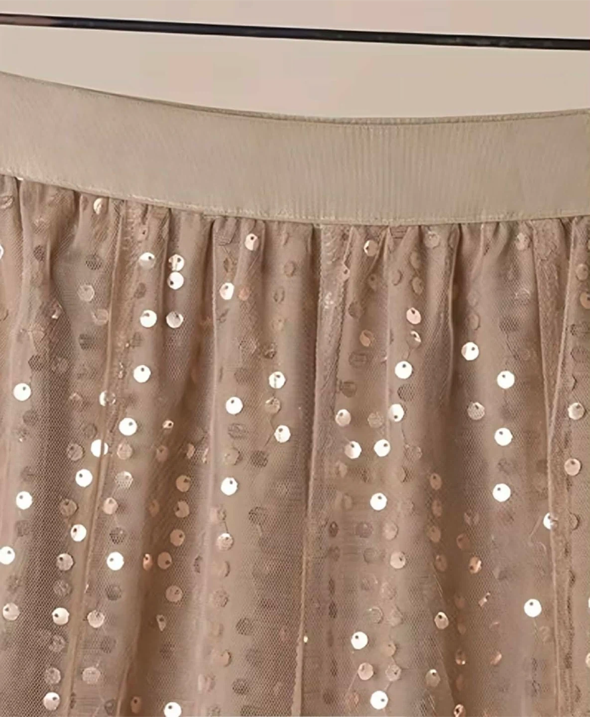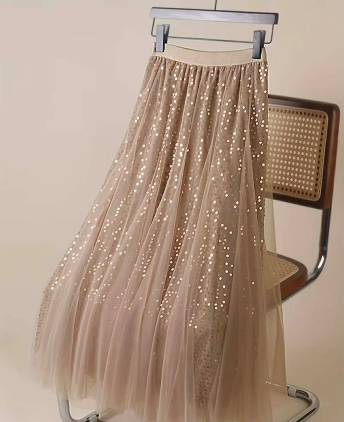 This elegant maxi skirt features a delicate tulle overlay with scattered sequins. It has an elastic waistband for a comfortable fit. The material is lightweight and flowing, perfect for special occasions. Measures approximately 38 inches long.