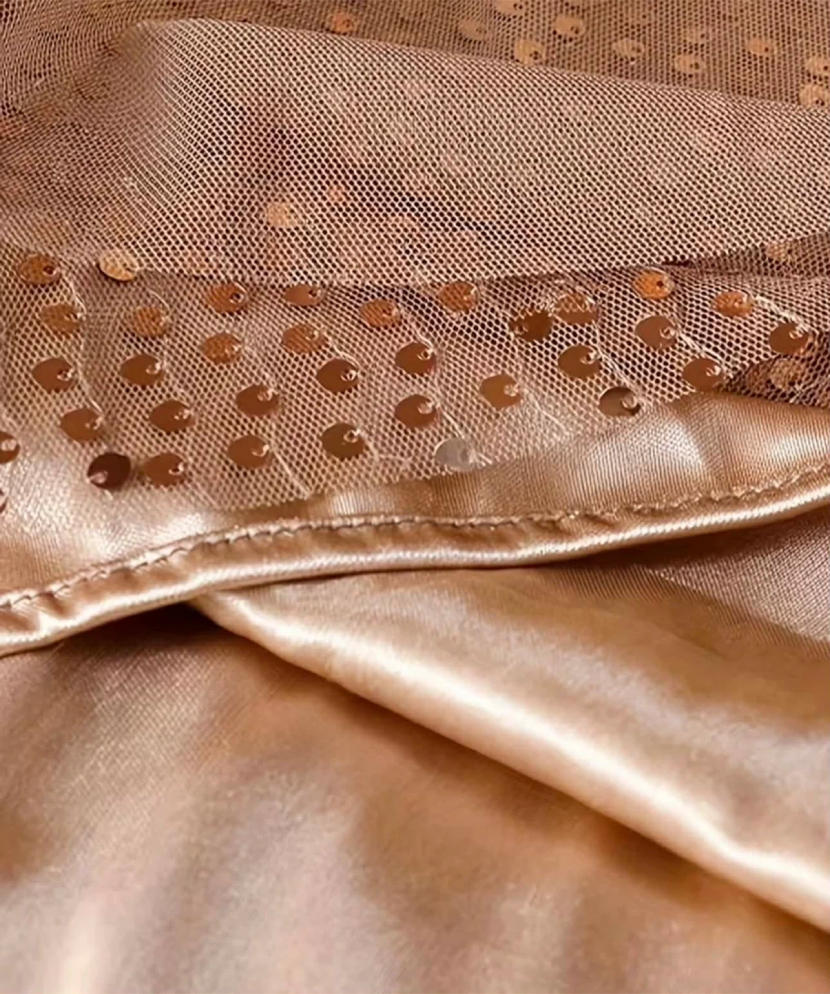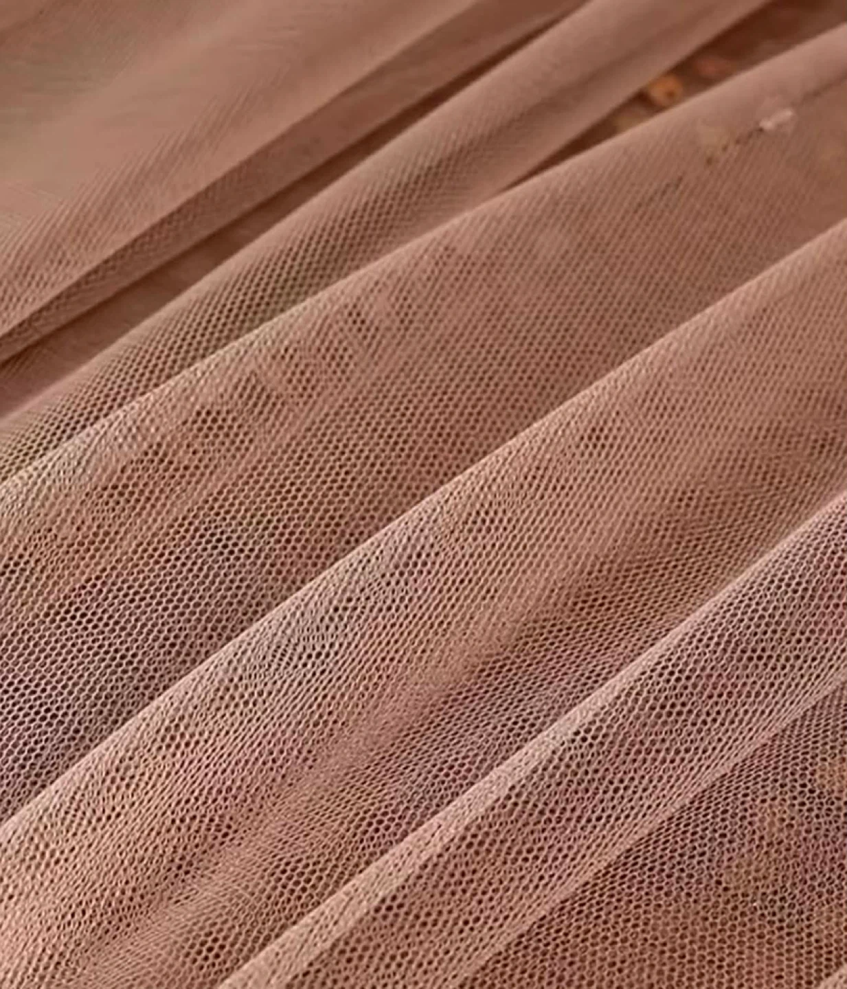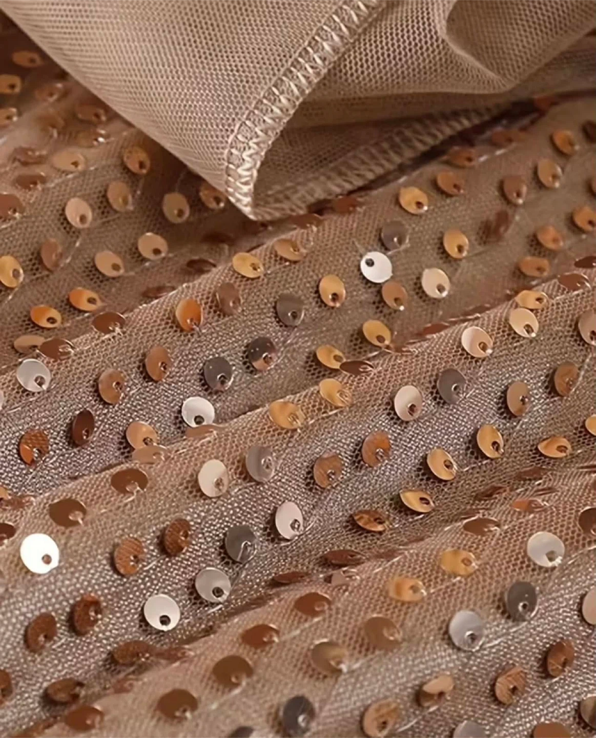 This elegant maxi skirt features a delicate tulle overlay with scattered sequins. It has an elastic waistband for a comfortable fit. The material is lightweight and flowing, perfect for special occasions. Measures approximately 38 inches long.