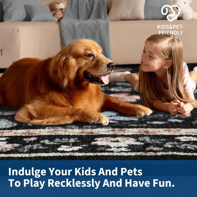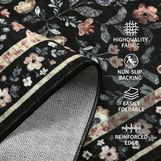 8x10 Washable Area Rug – Soft Black Vintage Floral Carpet