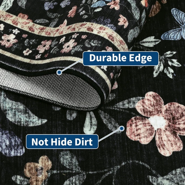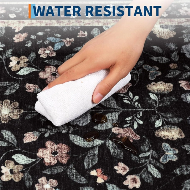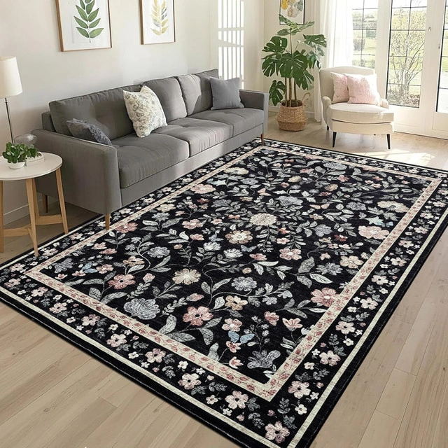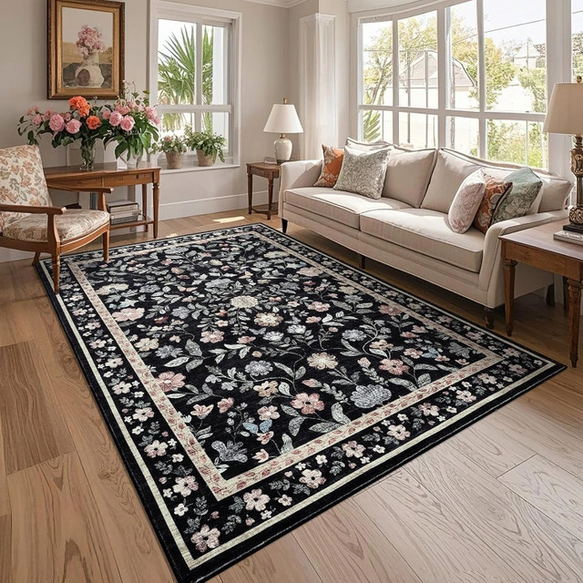 8x10 Washable Area Rug – Soft Black Vintage Floral Carpet